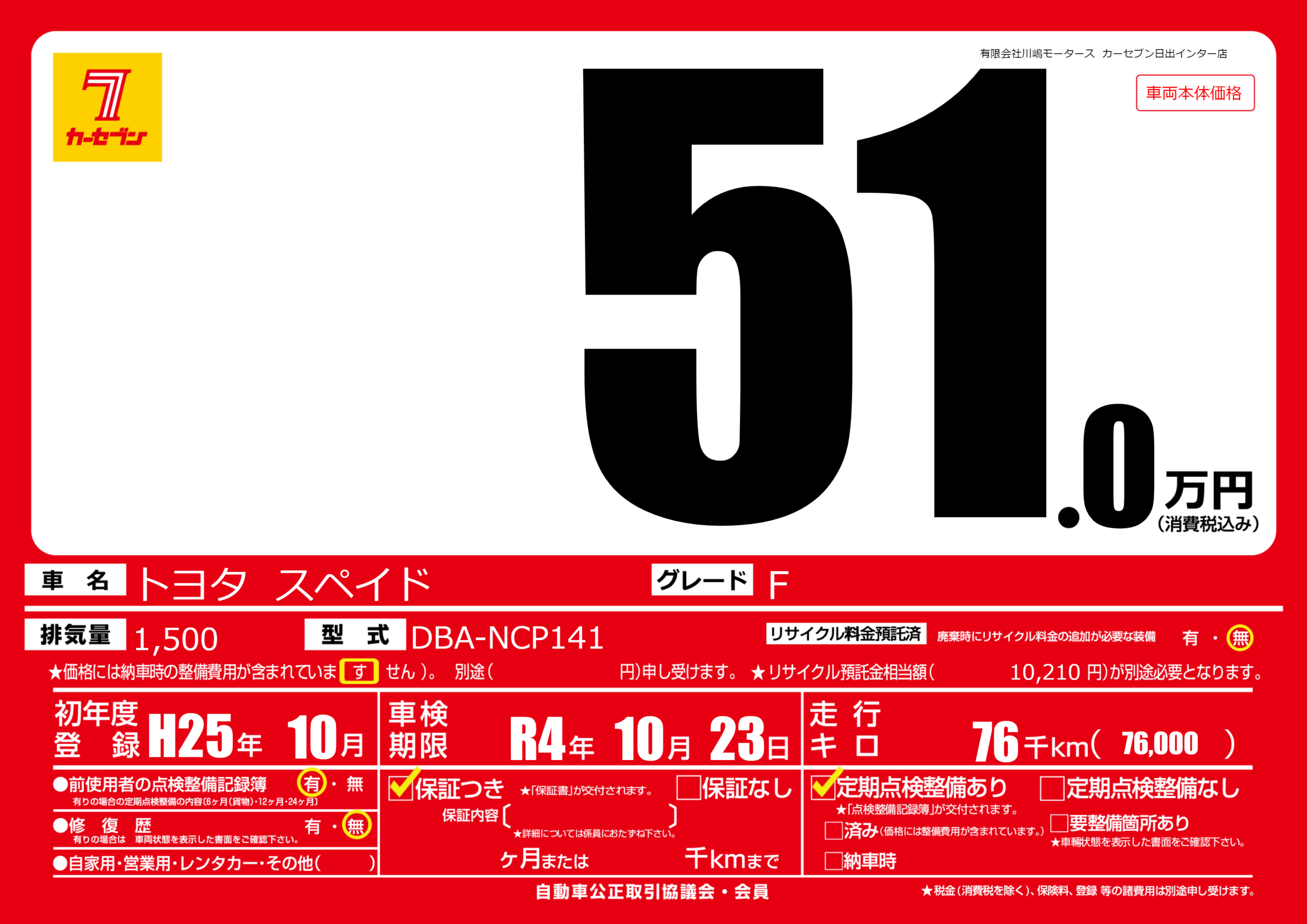 | 車名 | トヨタ スペイド | グレード ミッション 排気量 |