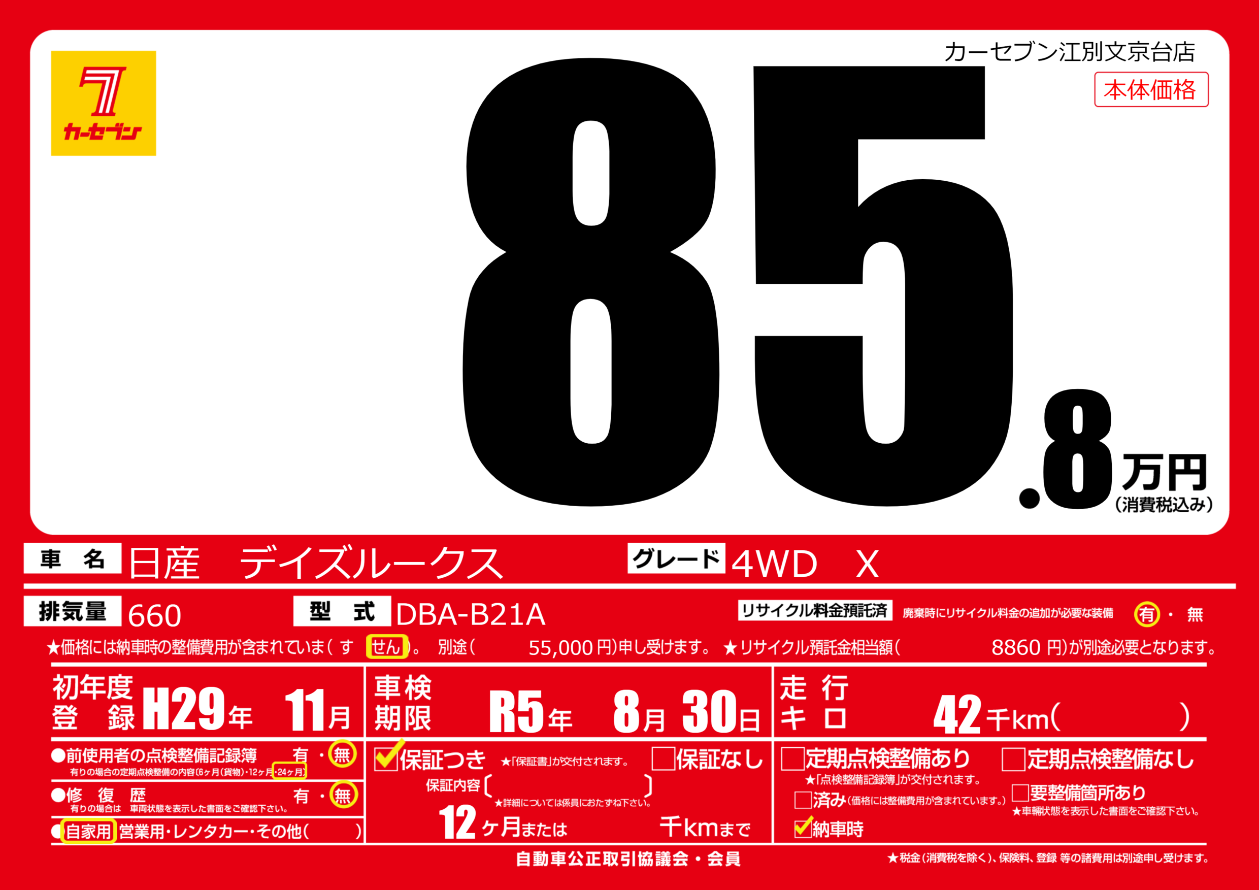 | 車名 | 日産 デイズルークス | グレード ミッション 排気量 |