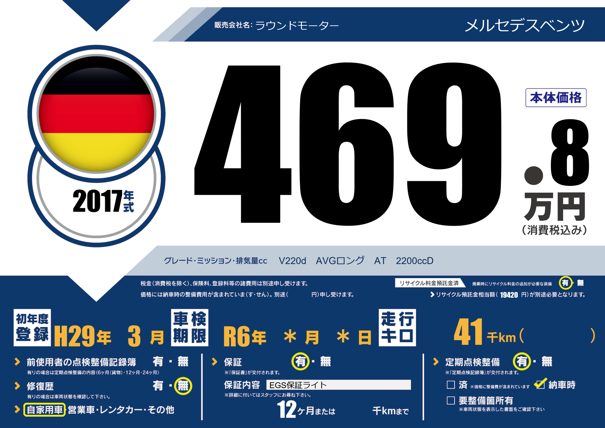 | 車名 | メルセデスベンツ | グレード ミッション 排気量 |