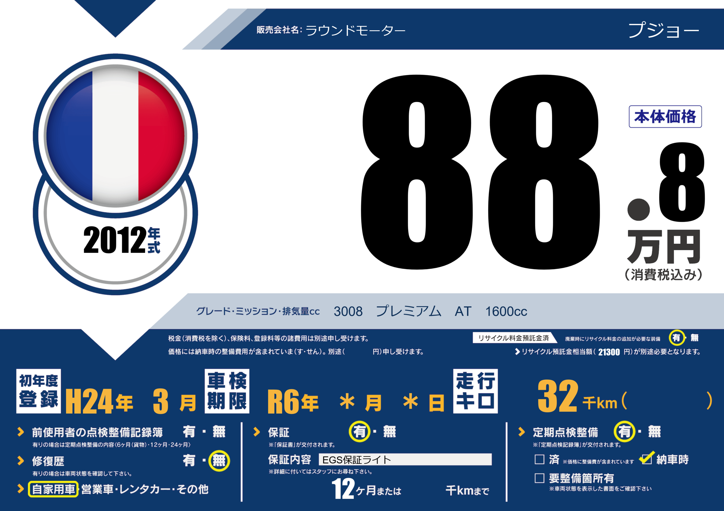 | 走行キロ | 3.2万km | 初年度登録 | H24年3月 |