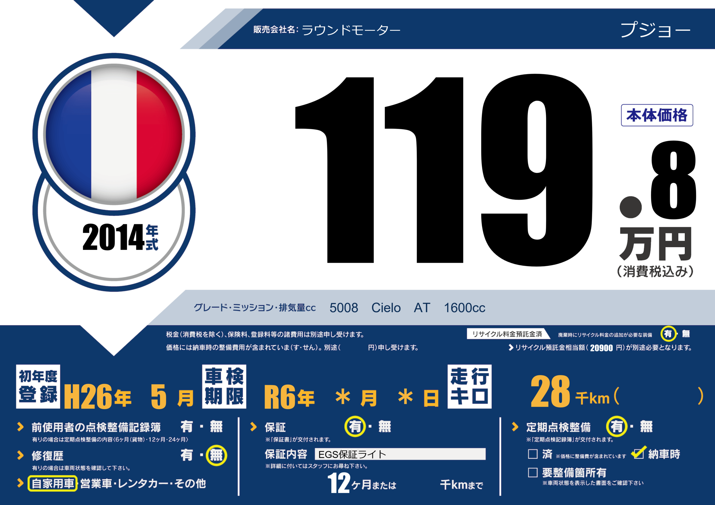 | 車名 | プジョー | グレード ミッション 排気量 |