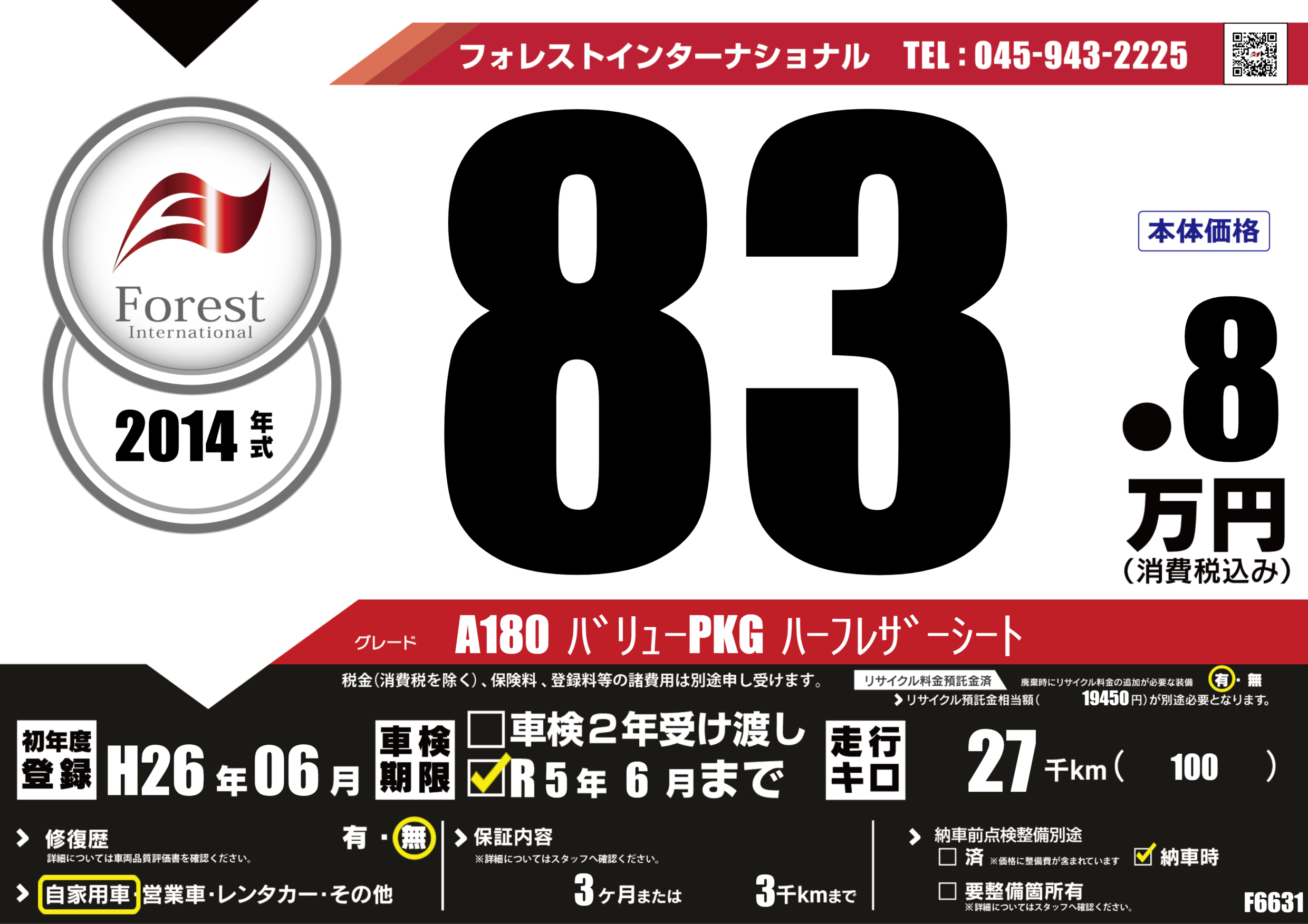 | 走行キロ | 2.7万km | 初年度登録 | H26年06月 |