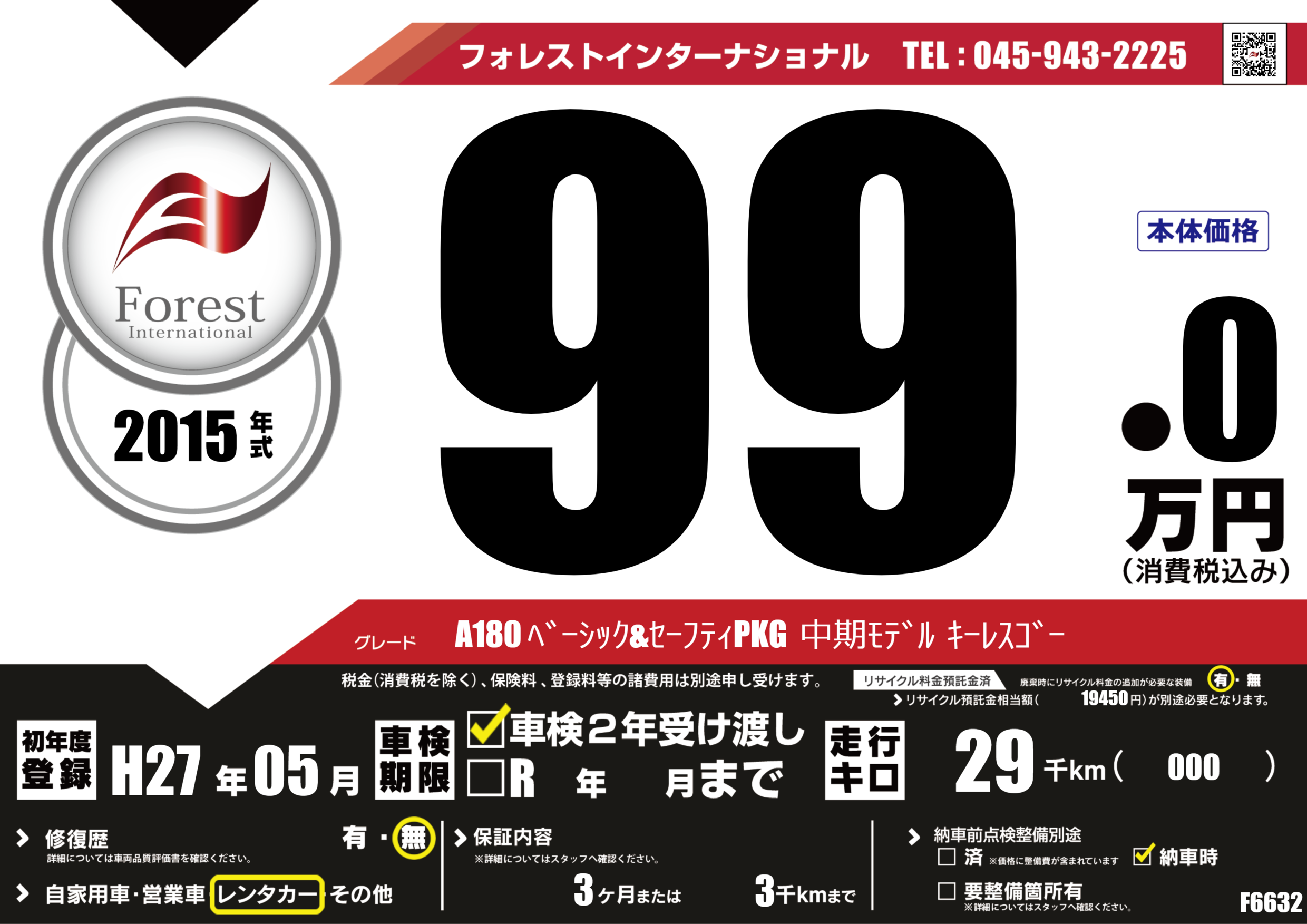 | 走行キロ | 2.9万km | 初年度登録 | H27年05月 |