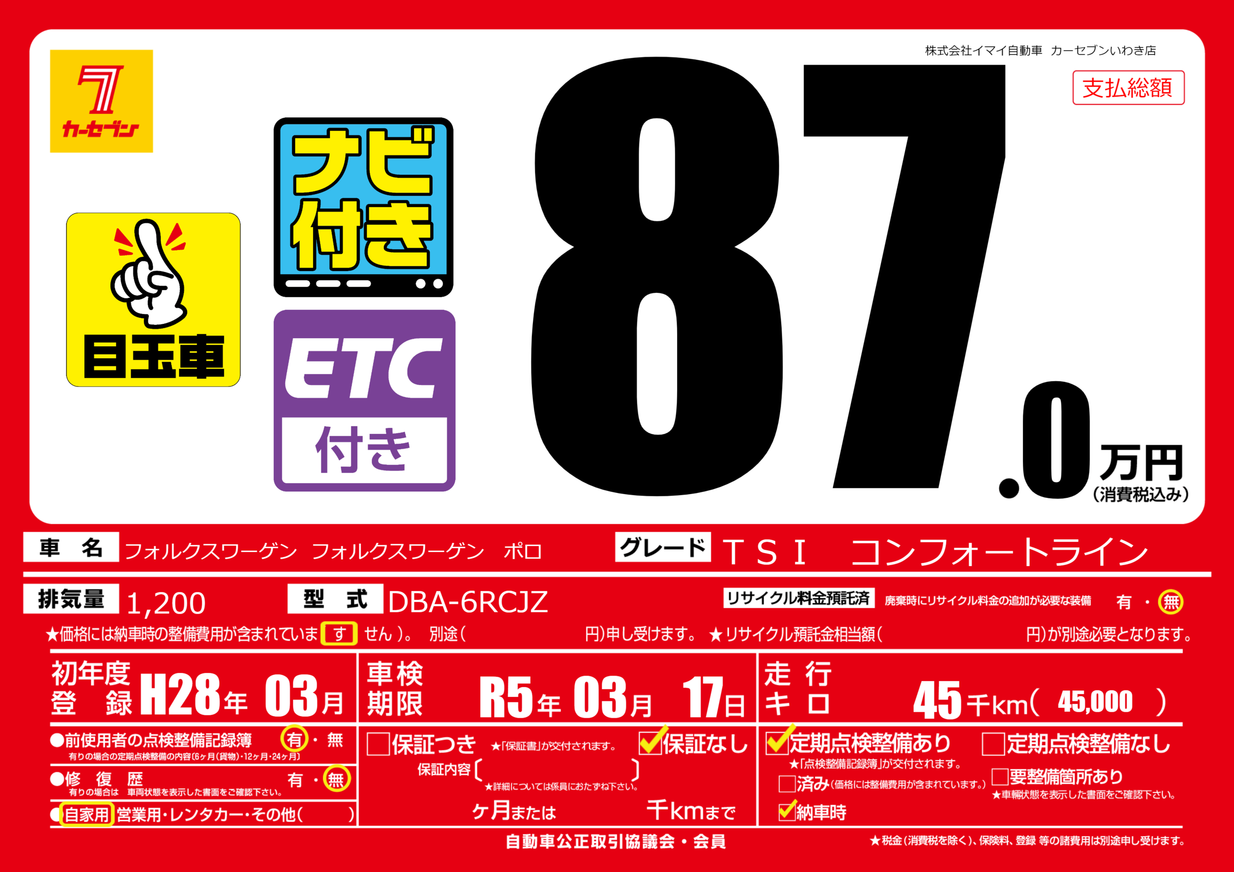 | 車名 | フォルクスワーゲン フォルクスワーゲン ポロ | グレード ミッション 排気量 |