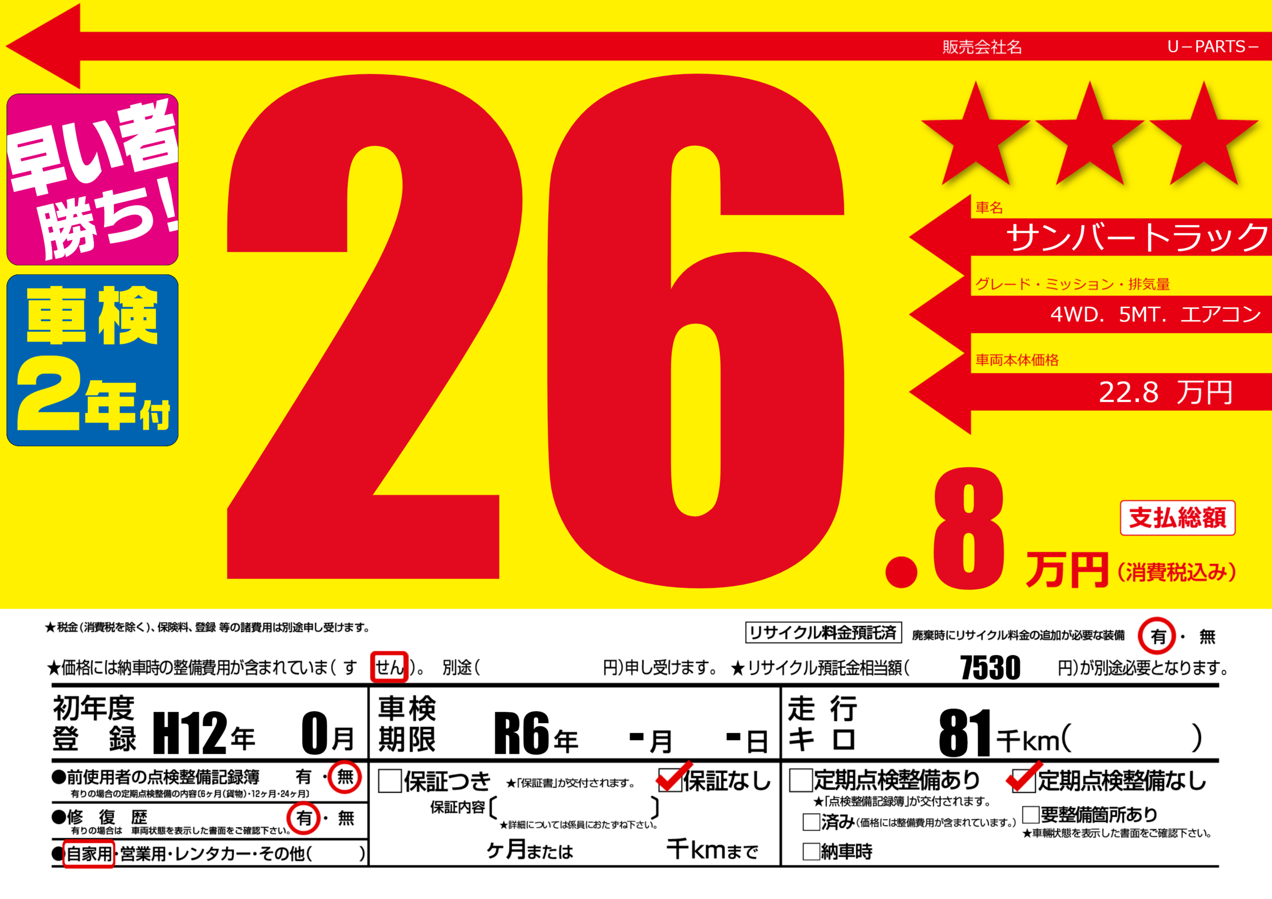 | 車名 | サンバートラック | グレード ミッション 排気量 |