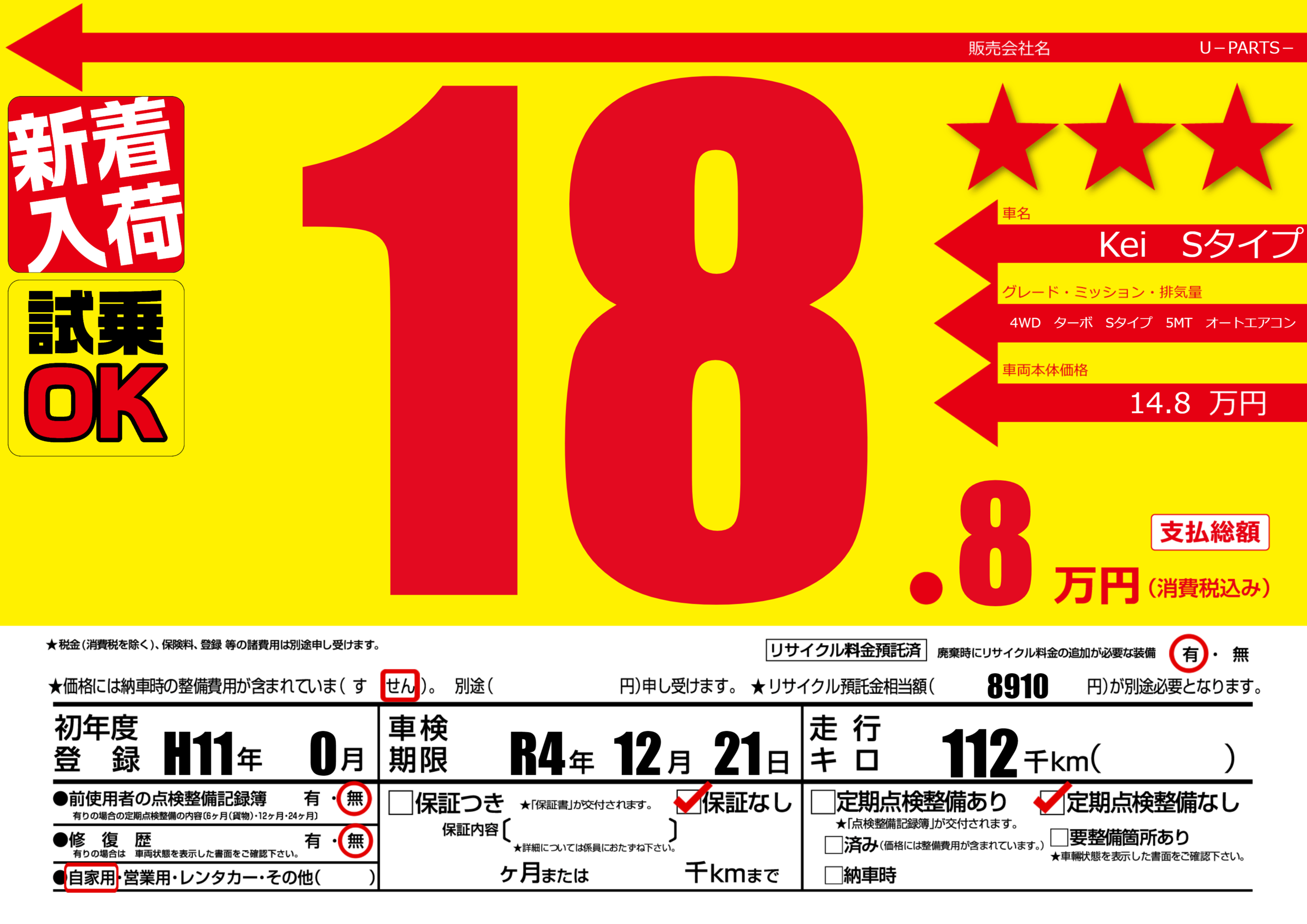 | 車名 | Kei Sタイプ | グレード ミッション 排気量 |