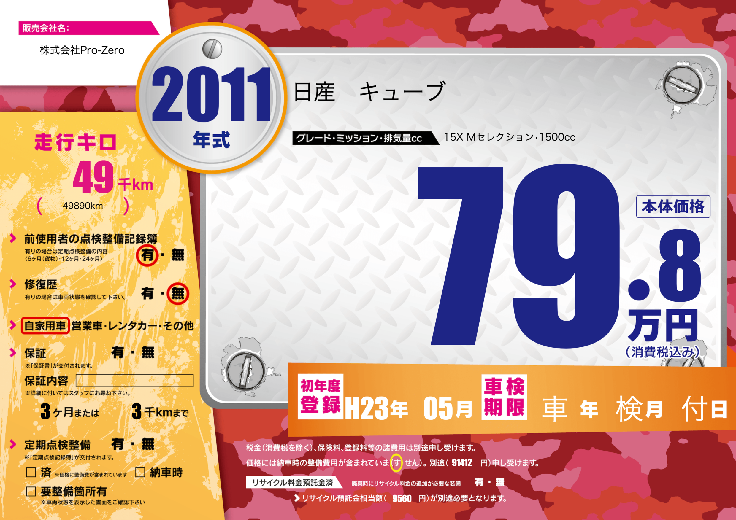 | 車名 | 日産 キューブ | グレード ミッション 排気量 |