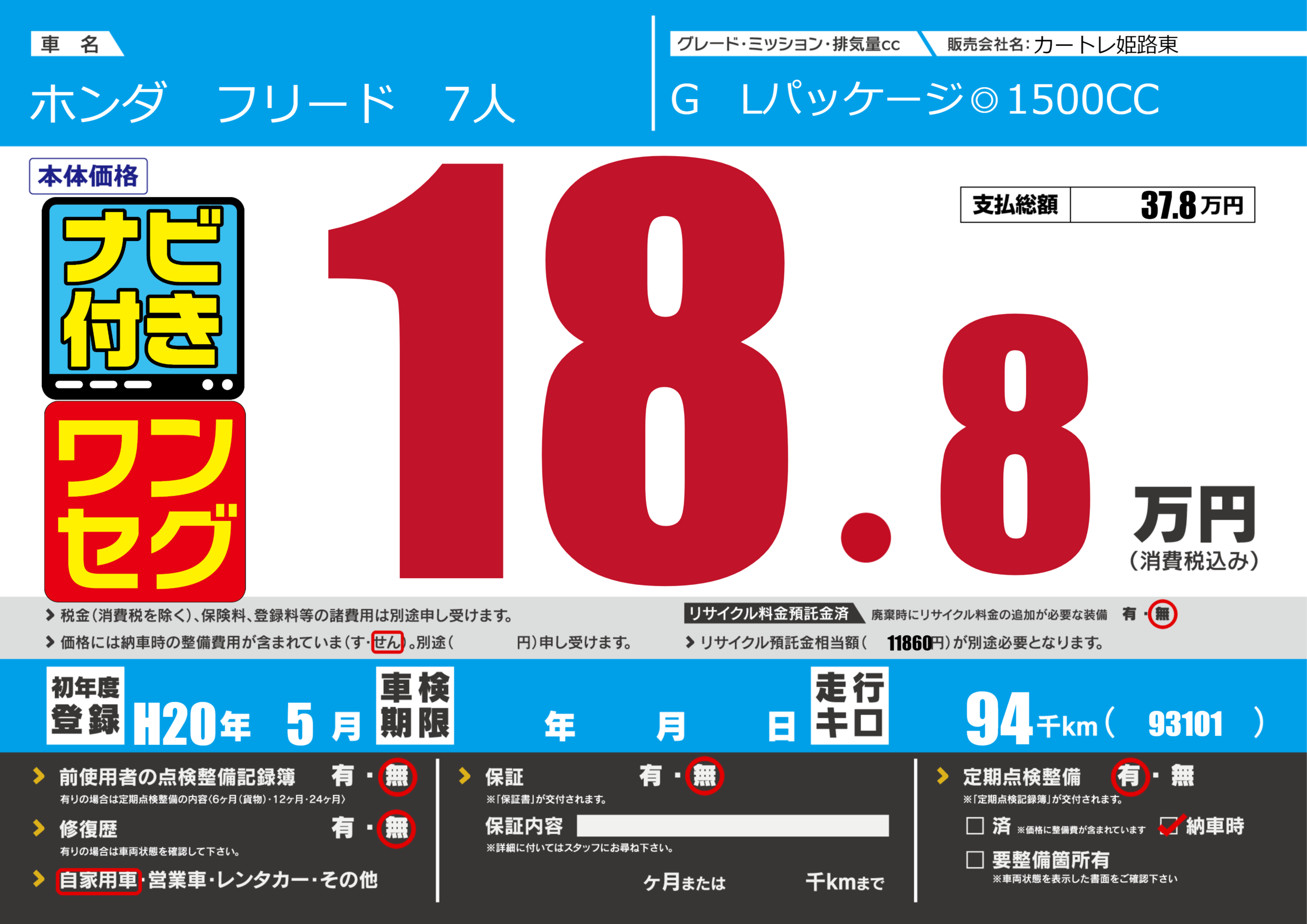 | 定期点検整備 | 定期点検整備あり 納車時あり | ||