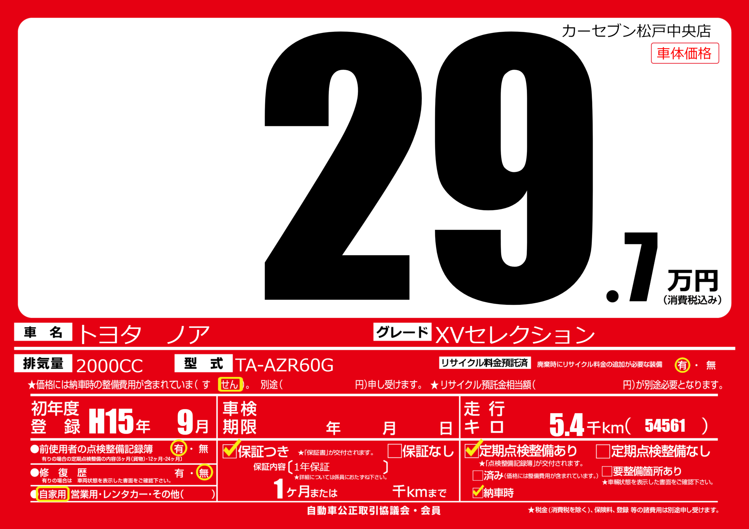| 走行キロ | 0.5万km | 初年度登録 | H15年9月 |