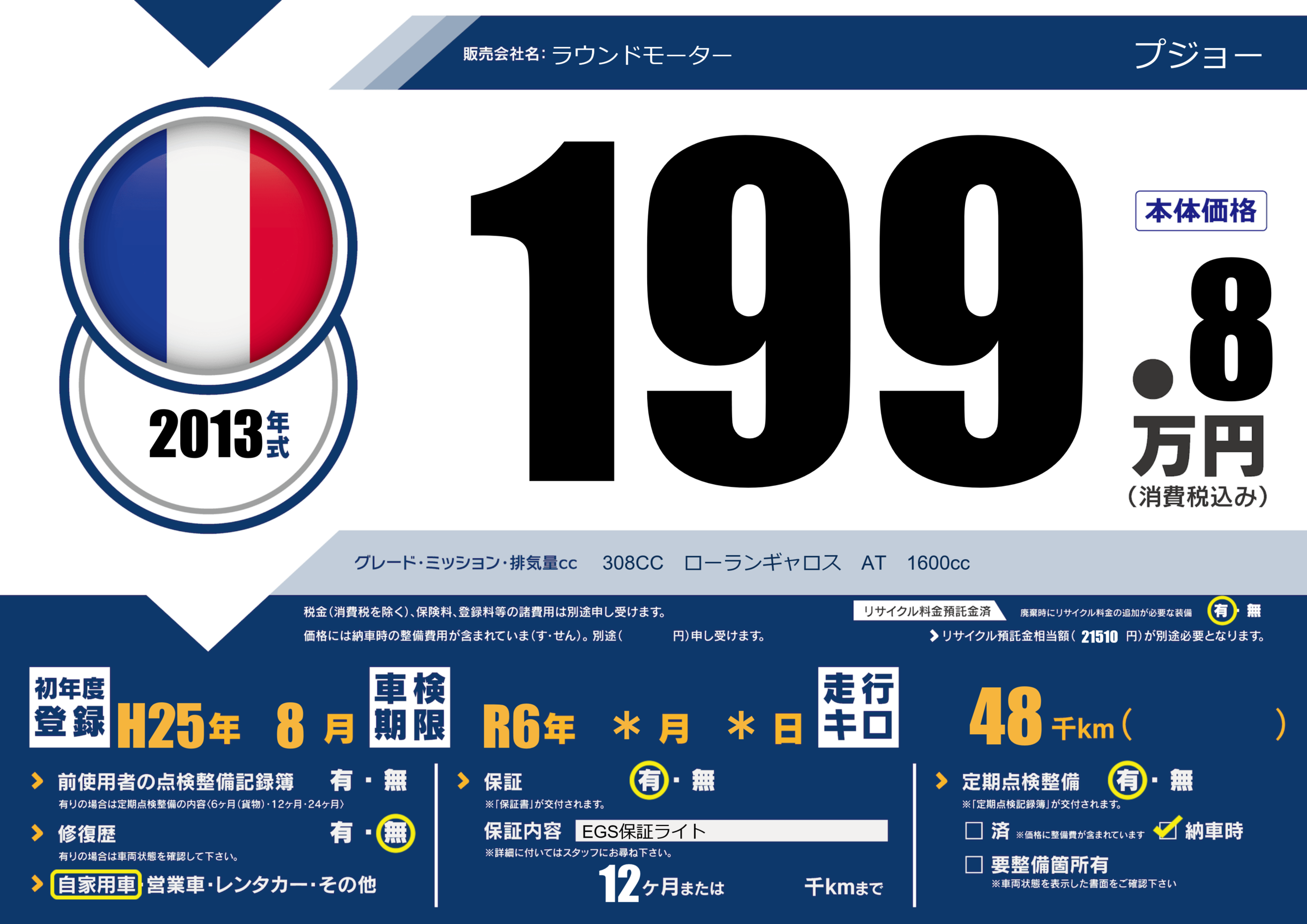 | 車名 | プジョー | グレード ミッション 排気量 |