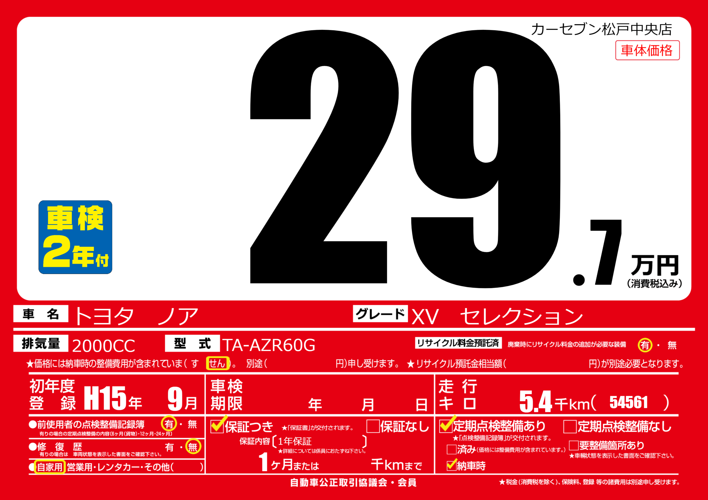 | 車名 | トヨタ ノア | グレード ミッション 排気量 |