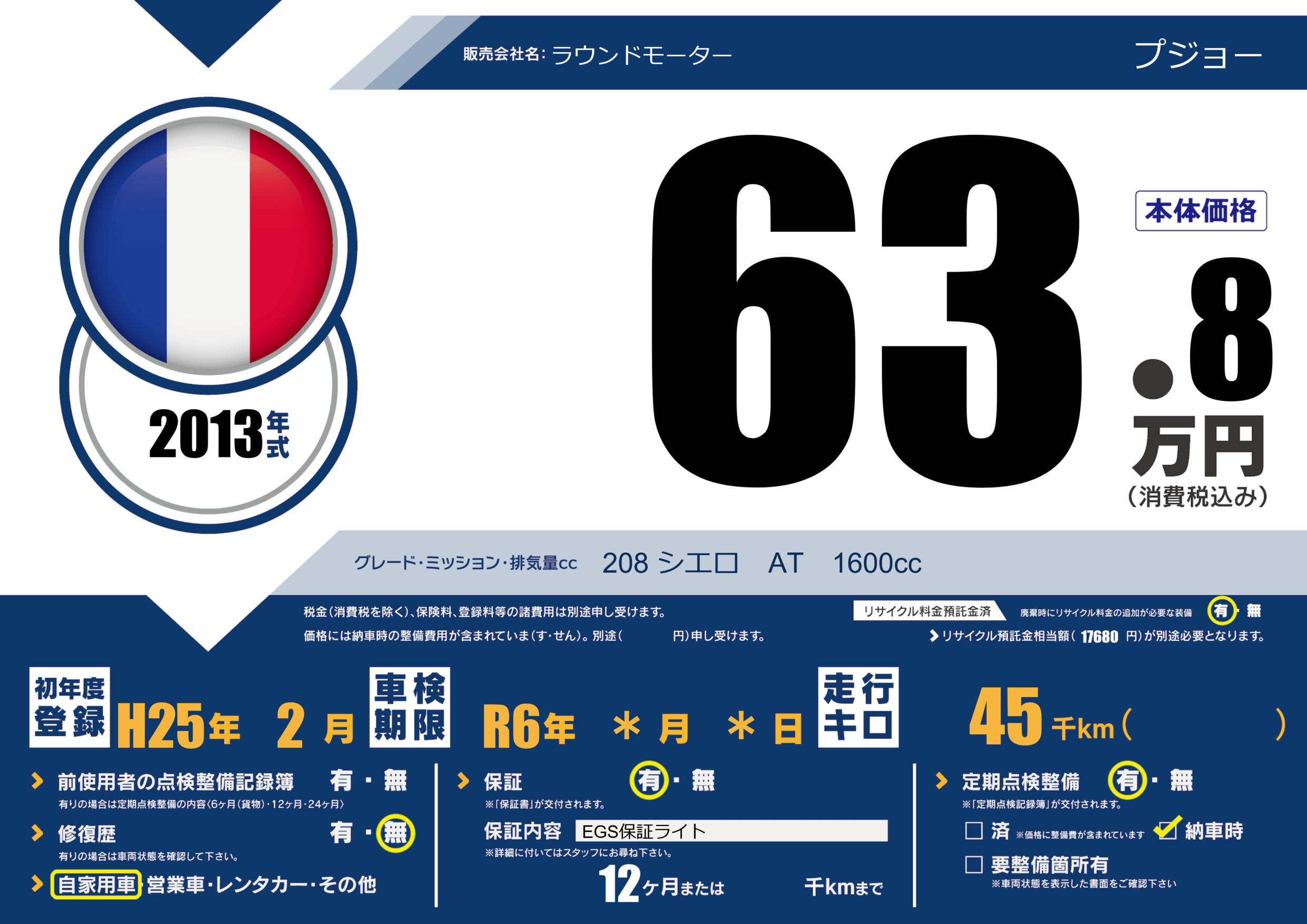 保証付き 保証内容(EGS保証ライト) 12ヶ月または()千kmまで |