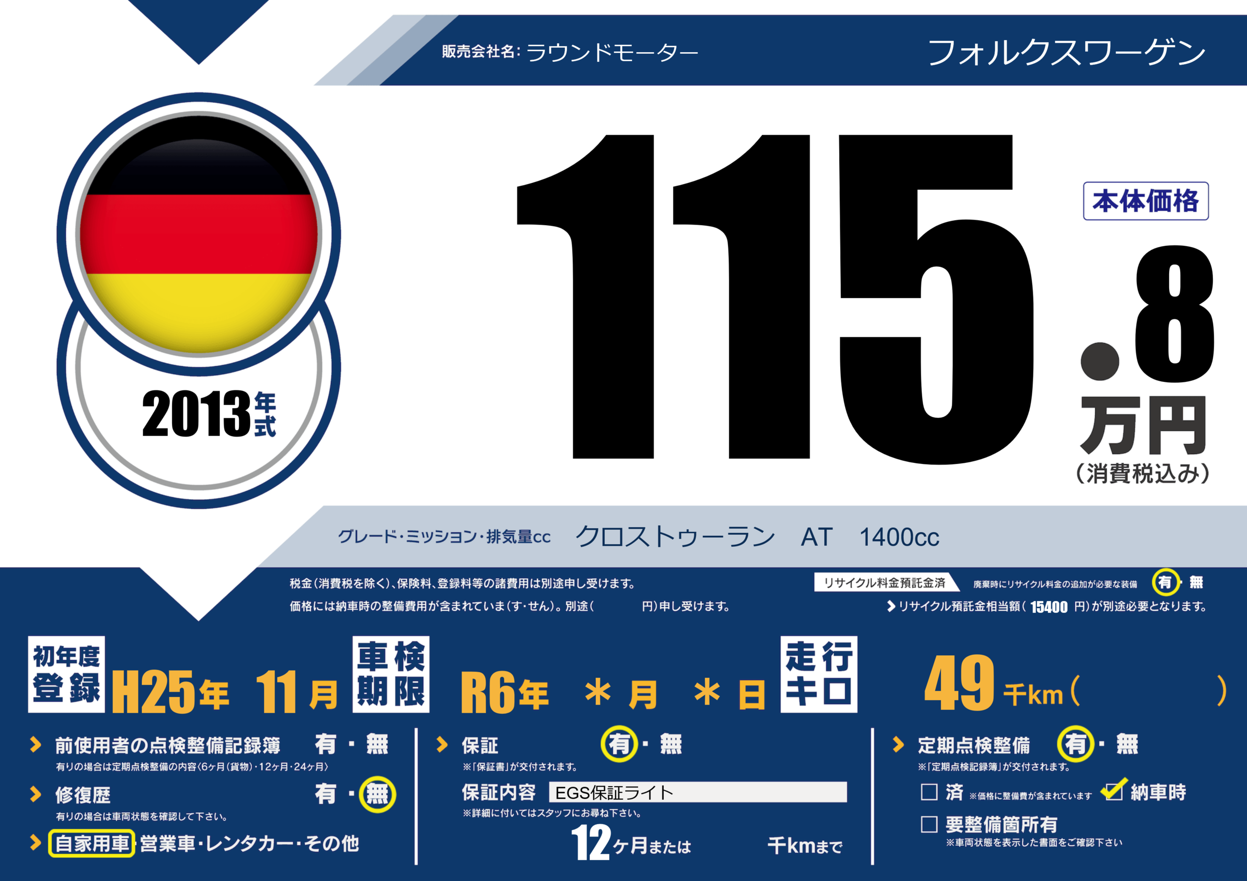 | 走行キロ | 4.9万km | 初年度登録 | H25年11月 |