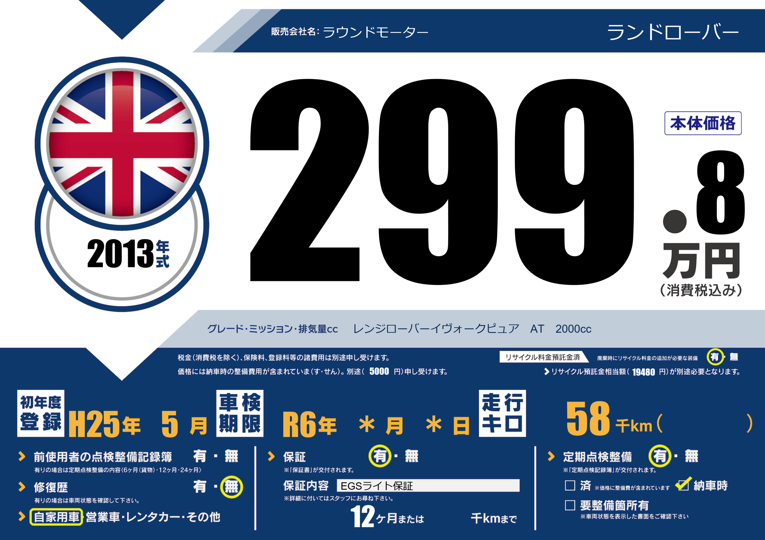 | 走行キロ | 5.8万km | 初年度登録 | H25年5月 |