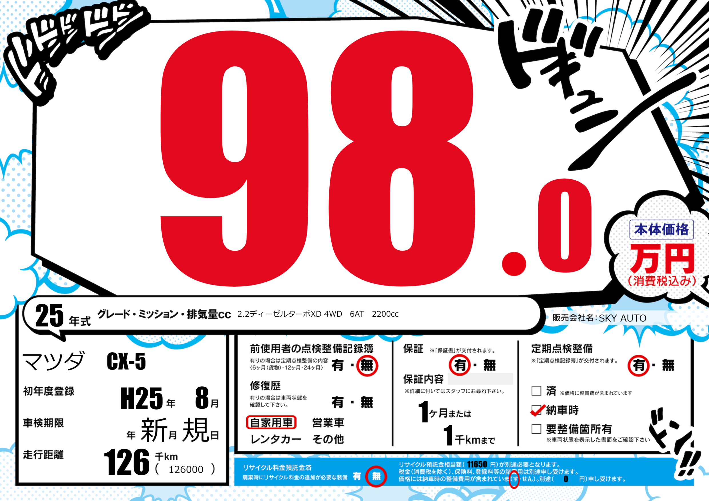 | 車名 | マツダ CX-5 | グレード ミッション 排気量 |