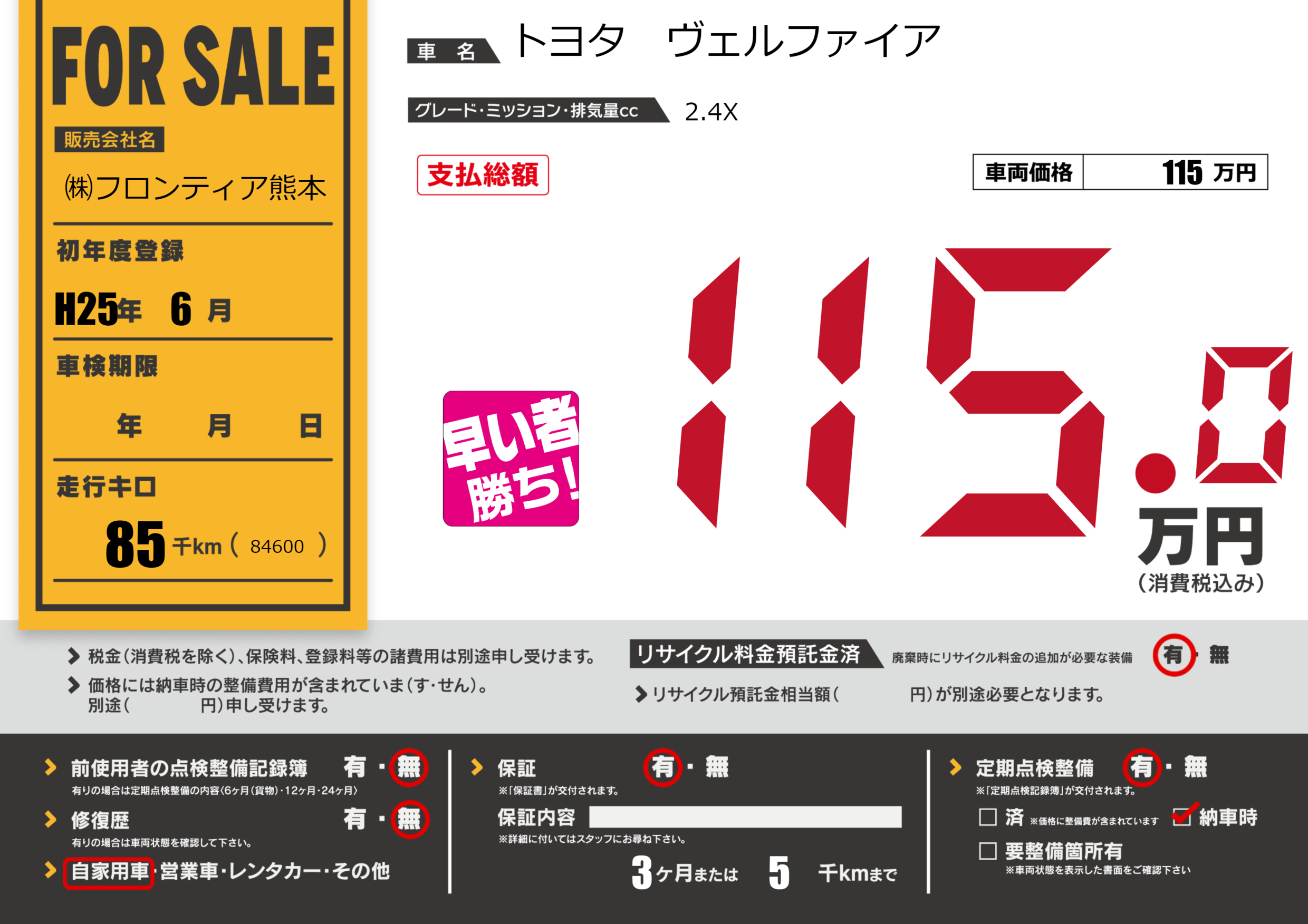 | 車名 | トヨタ ヴェルファイア | グレード ミッション 排気量 |