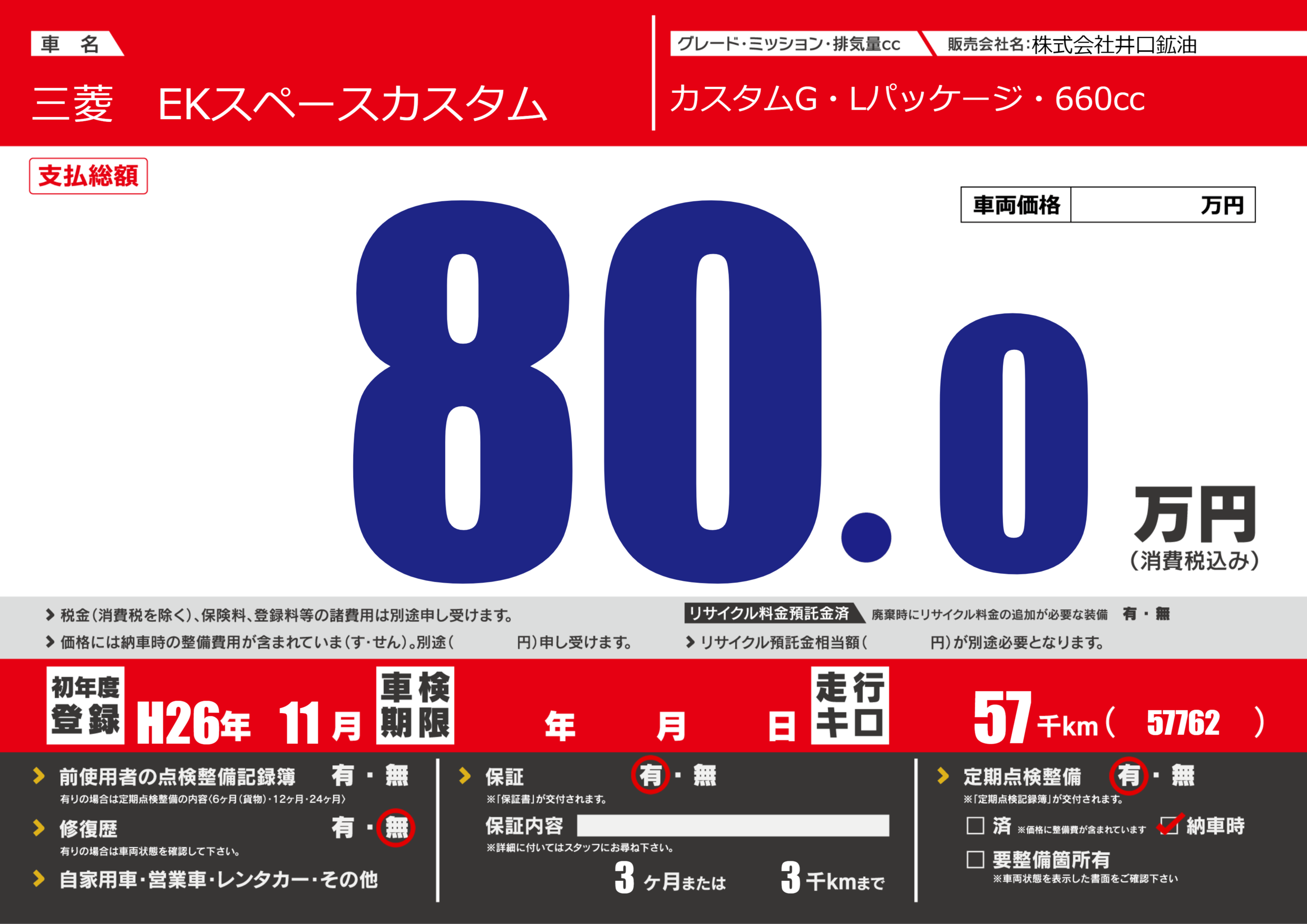 | 走行キロ | 5.7万km | 初年度登録 | H26年11月 |