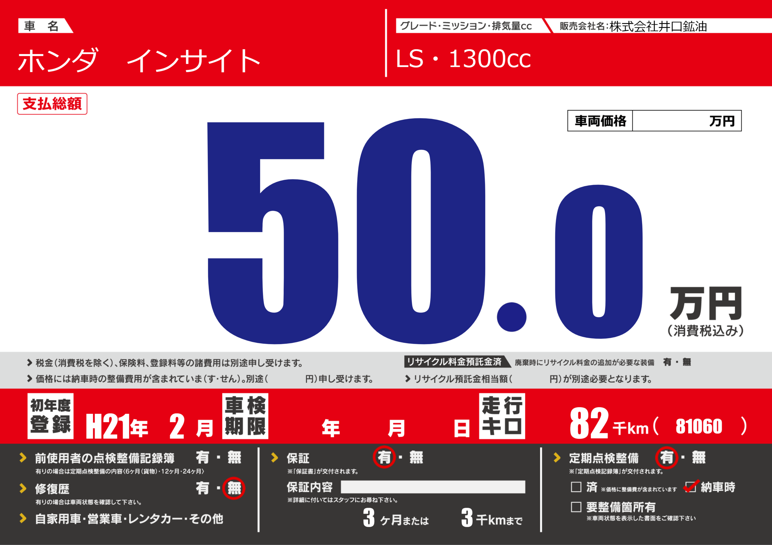 保証付き 保証内容(---) 3ヶ月または(3)千kmまで |