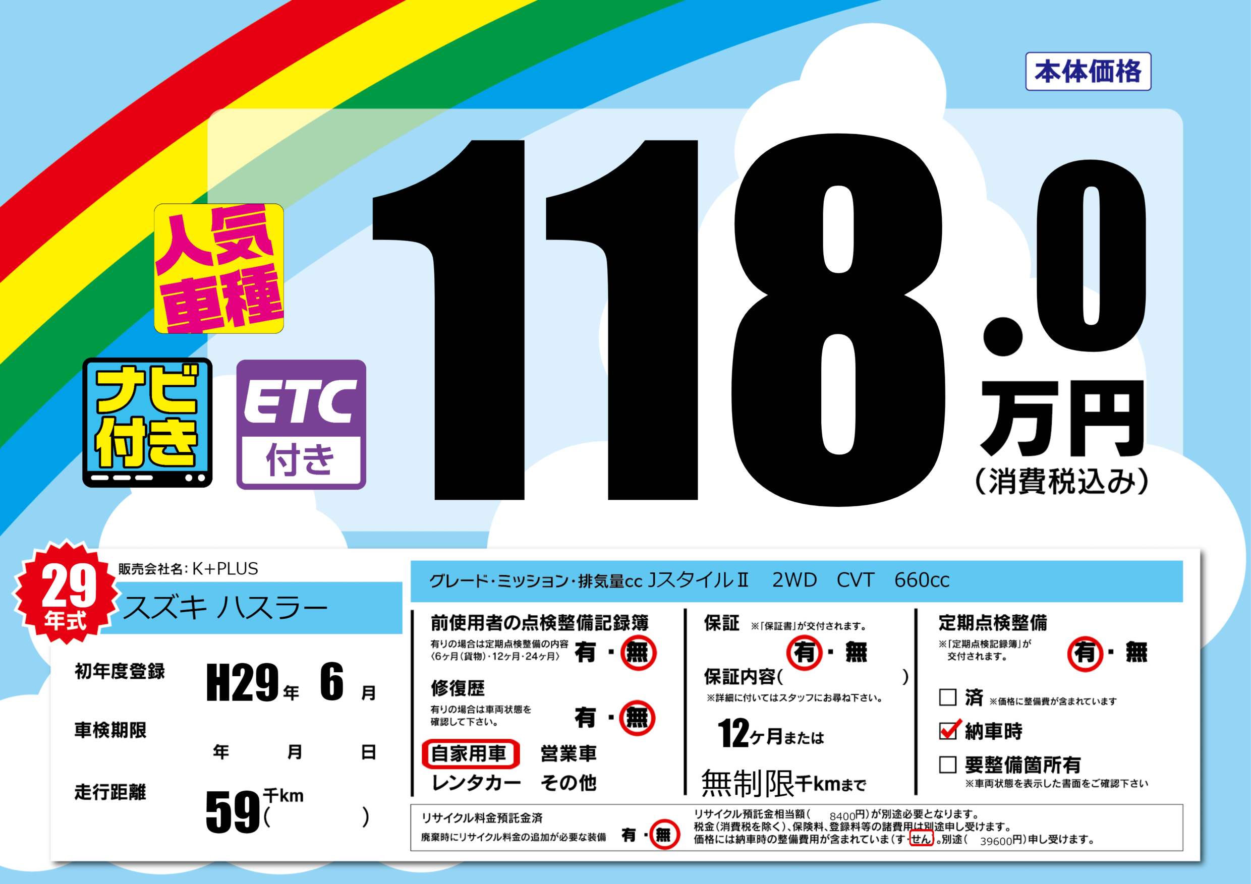 | 車名 | スズキ ハスラー | グレード ミッション 排気量 |