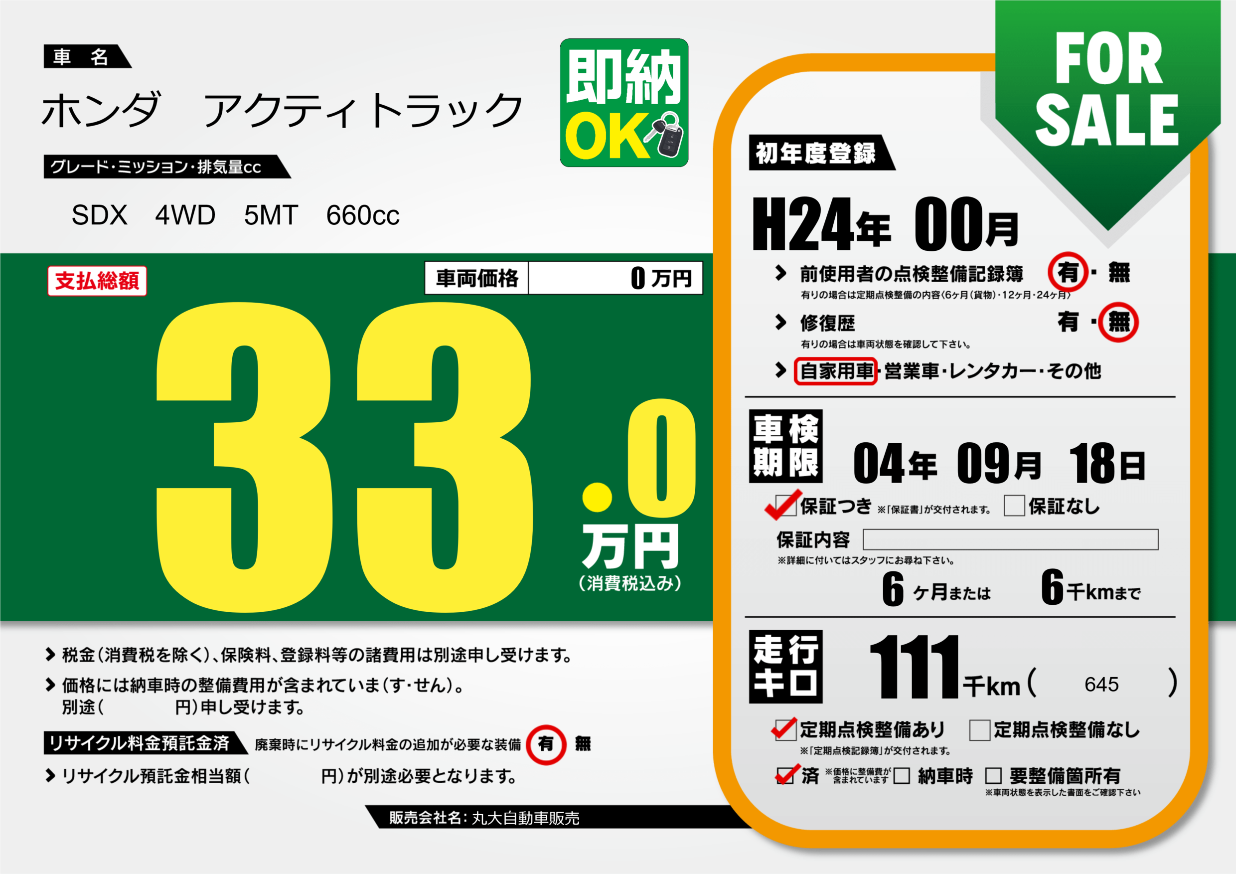 | 定期点検整備 | 定期点検整備あり 定期点検整備済み | ||