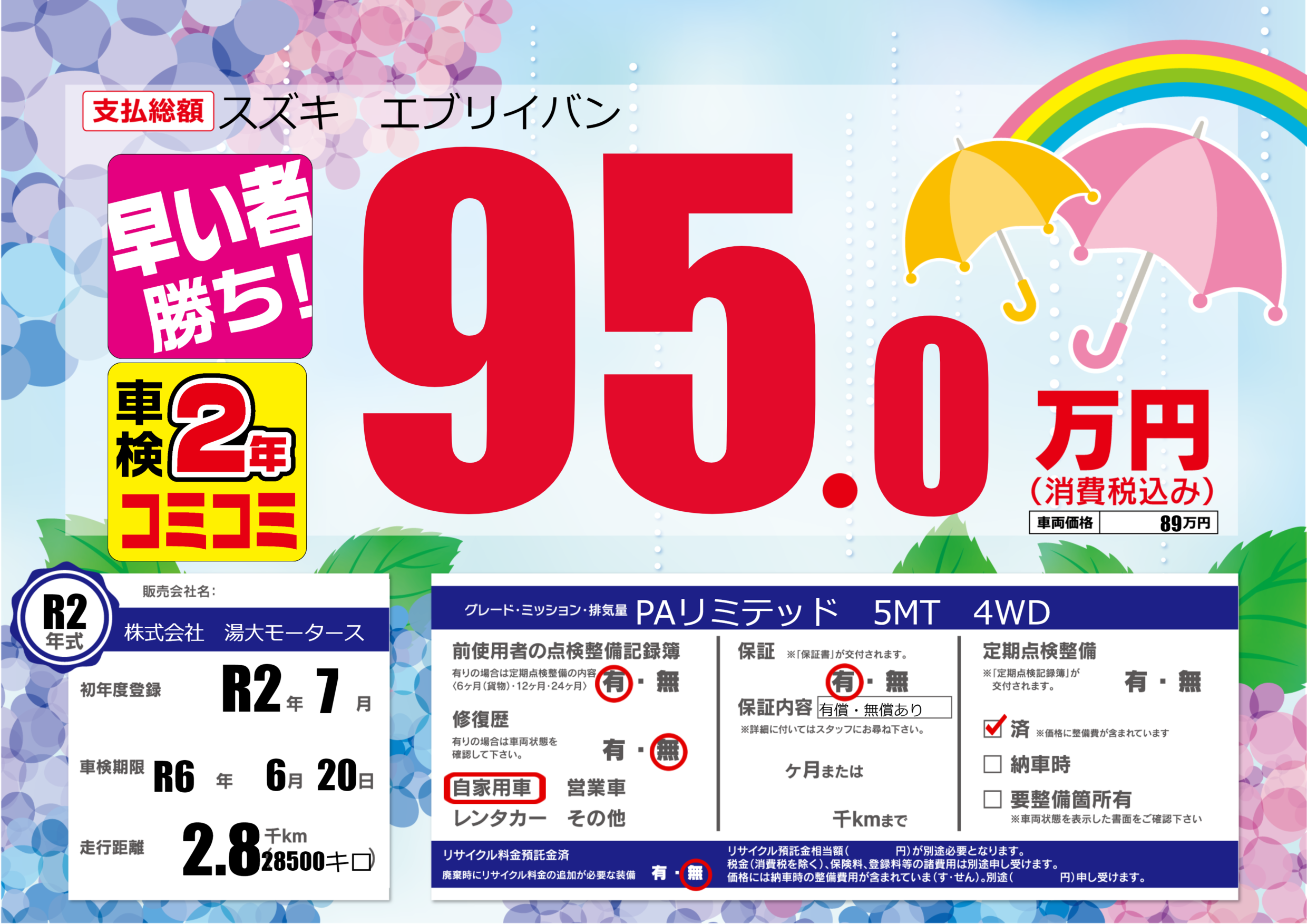 | 車名 | スズキ エブリイバン | グレード ミッション 排気量 |
