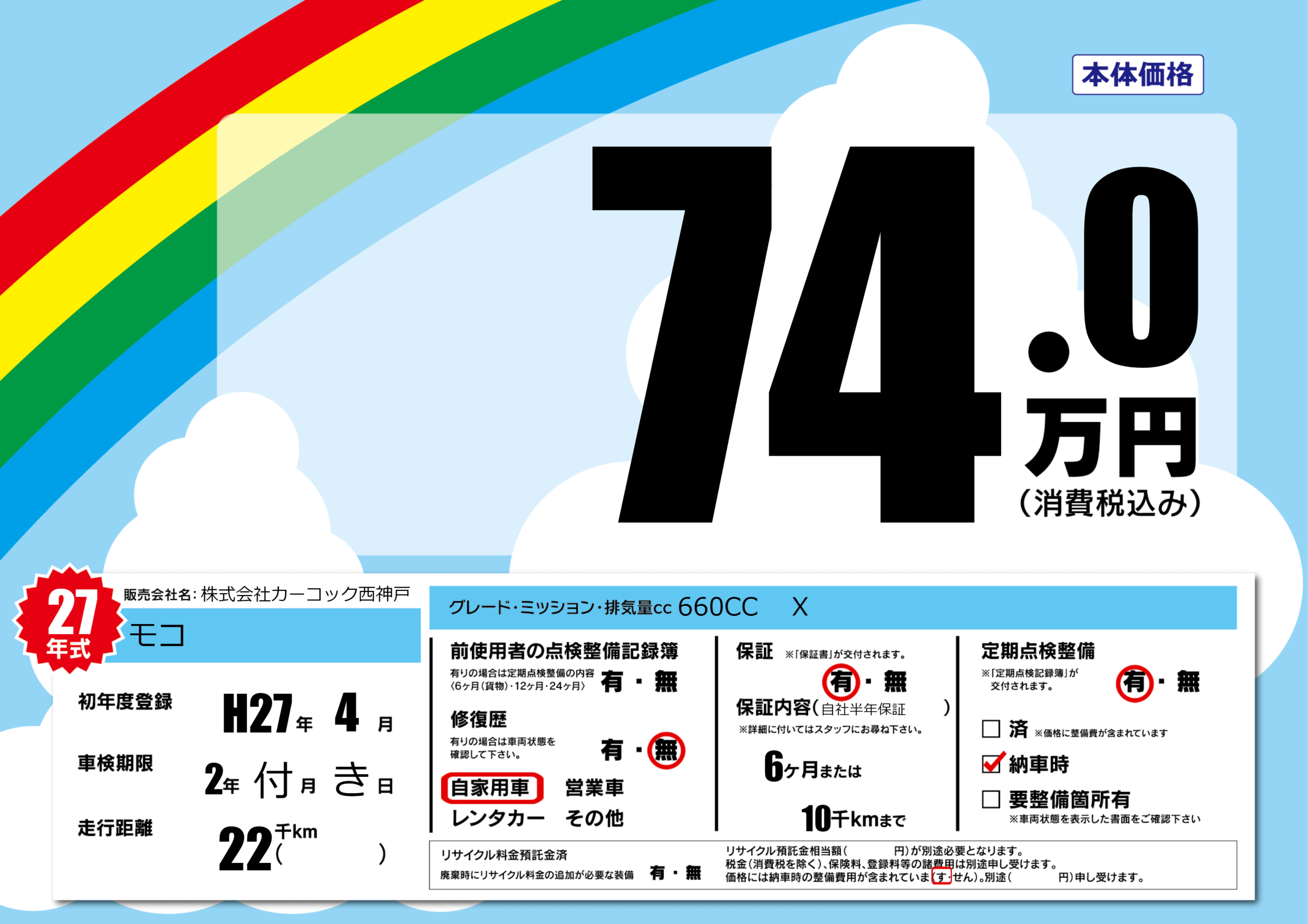 | 走行キロ | 2.2万km | 初年度登録 | H27年4月 |