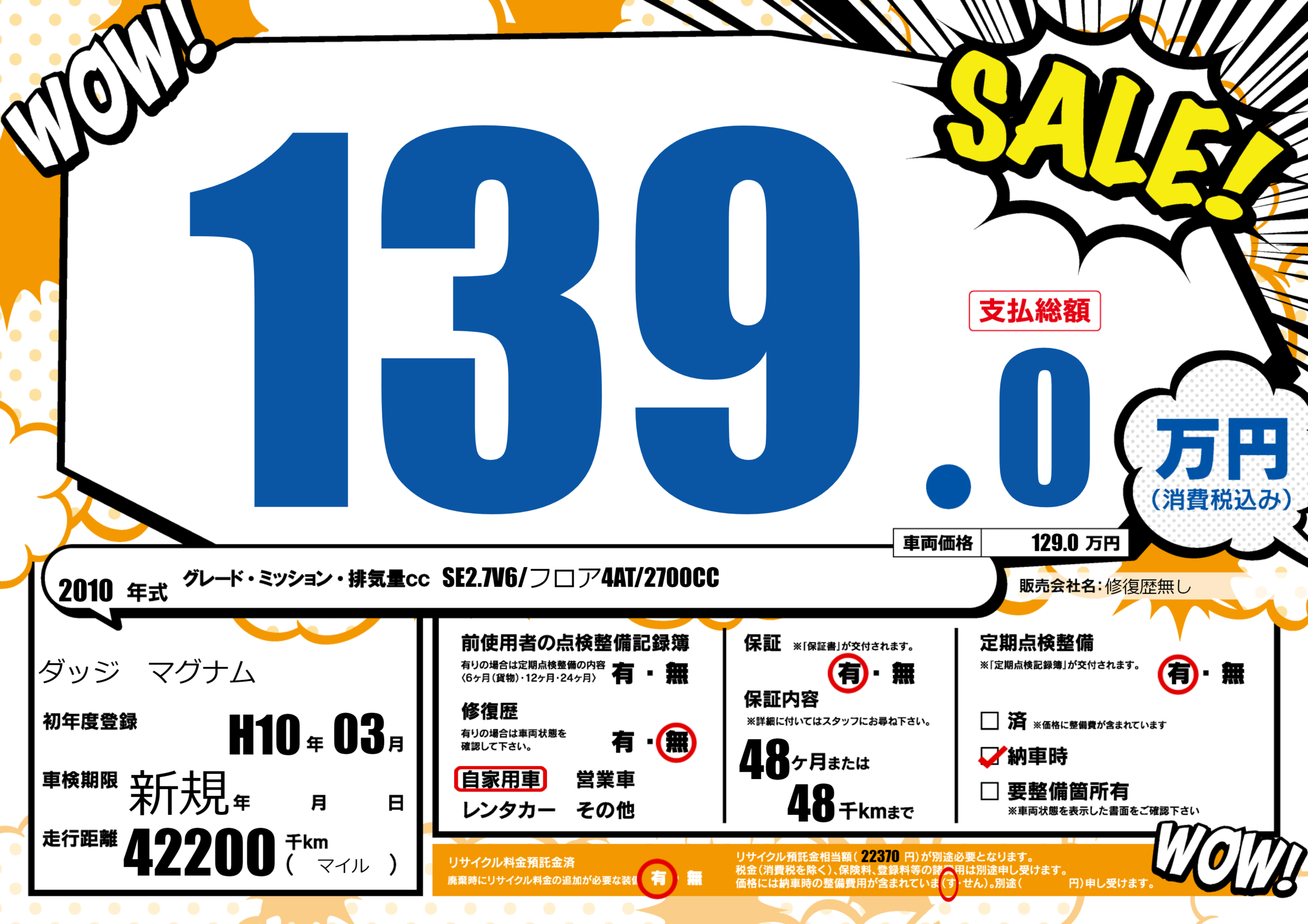 | 車名 | ダッジ マグナム | グレード ミッション 排気量 |