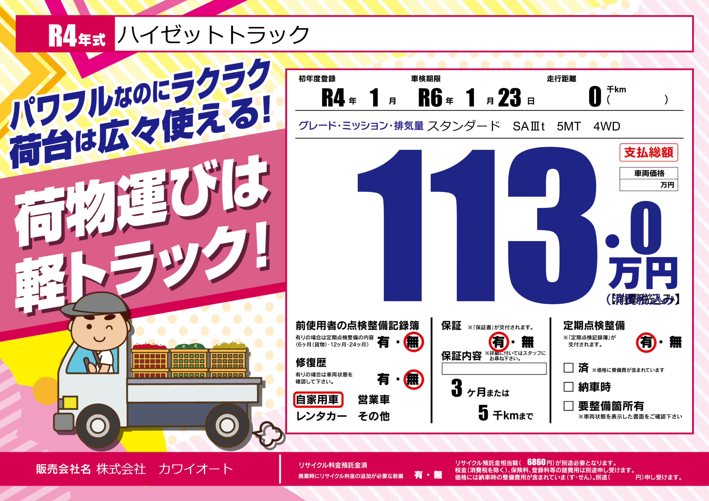 | 車名 | ハイゼットトラック | グレード ミッション 排気量 |
