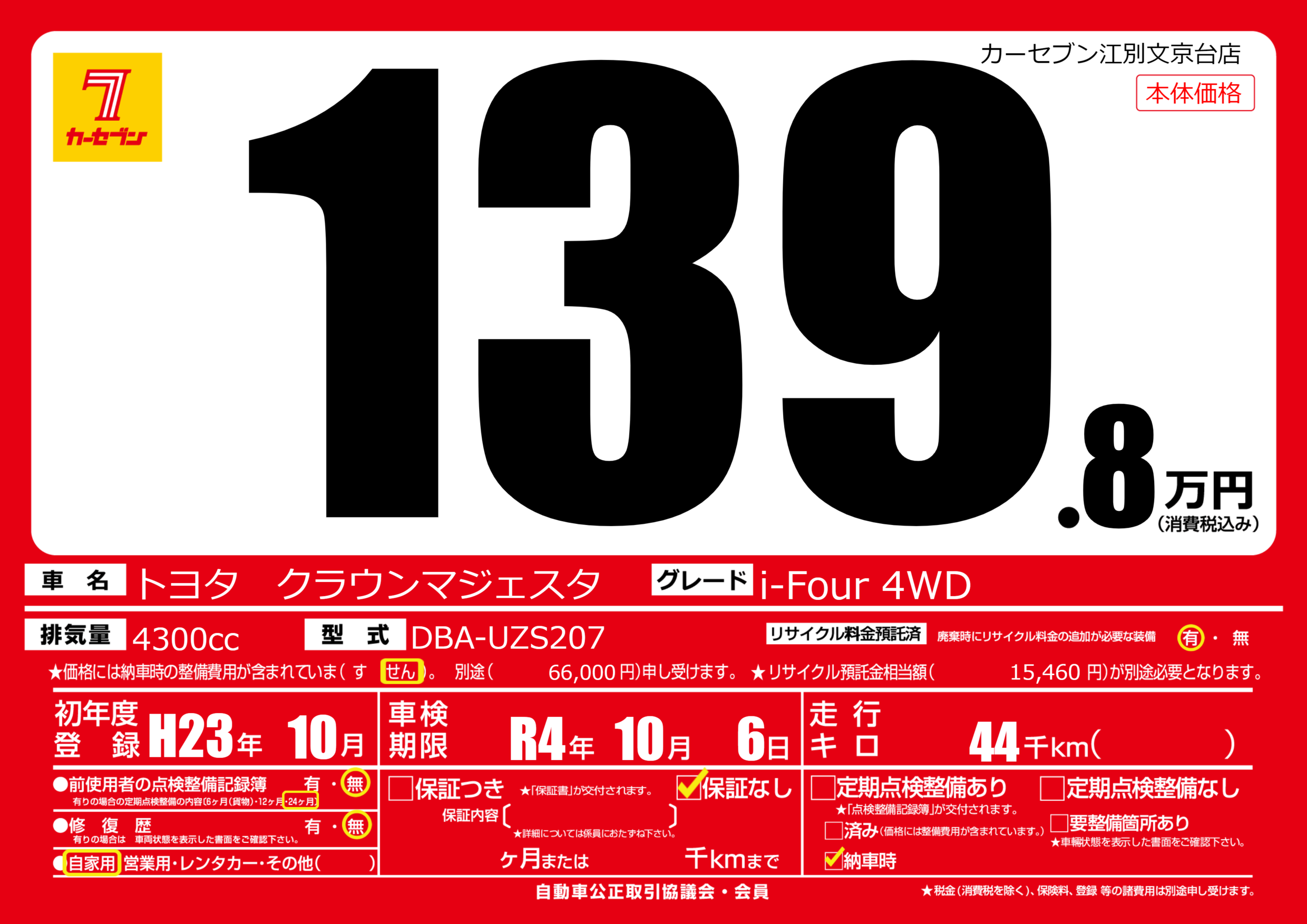 | 車名 | トヨタ クラウンマジェスタ | グレード ミッション 排気量 |