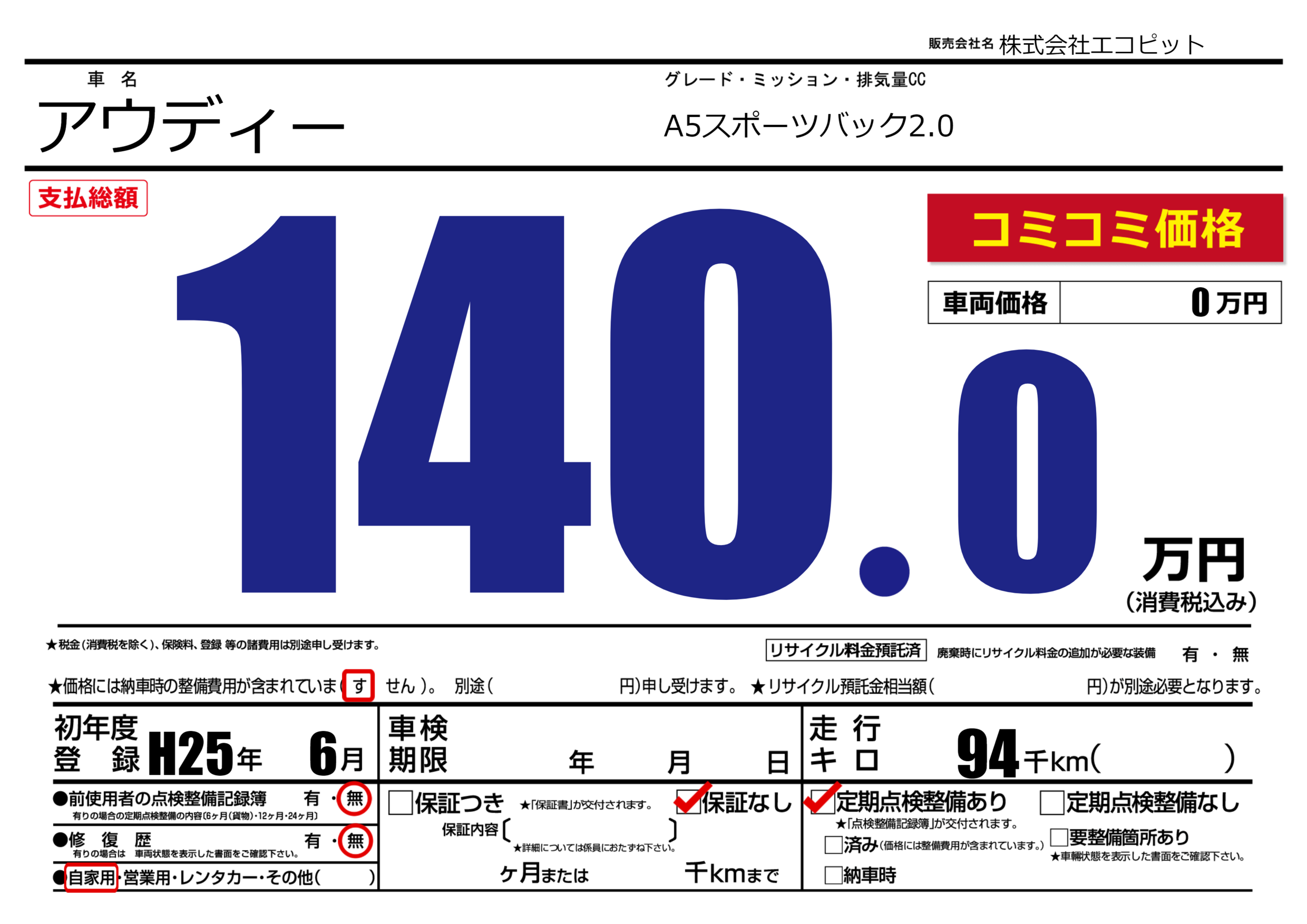 | 定期点検整備 | 定期点検整備あり | ||