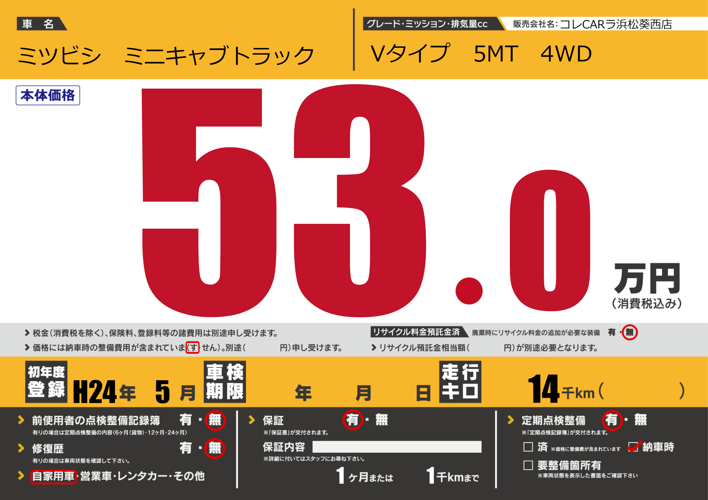 | 車名 | ミツビシ ミニキャブトラック | グレード ミッション 排気量 |
