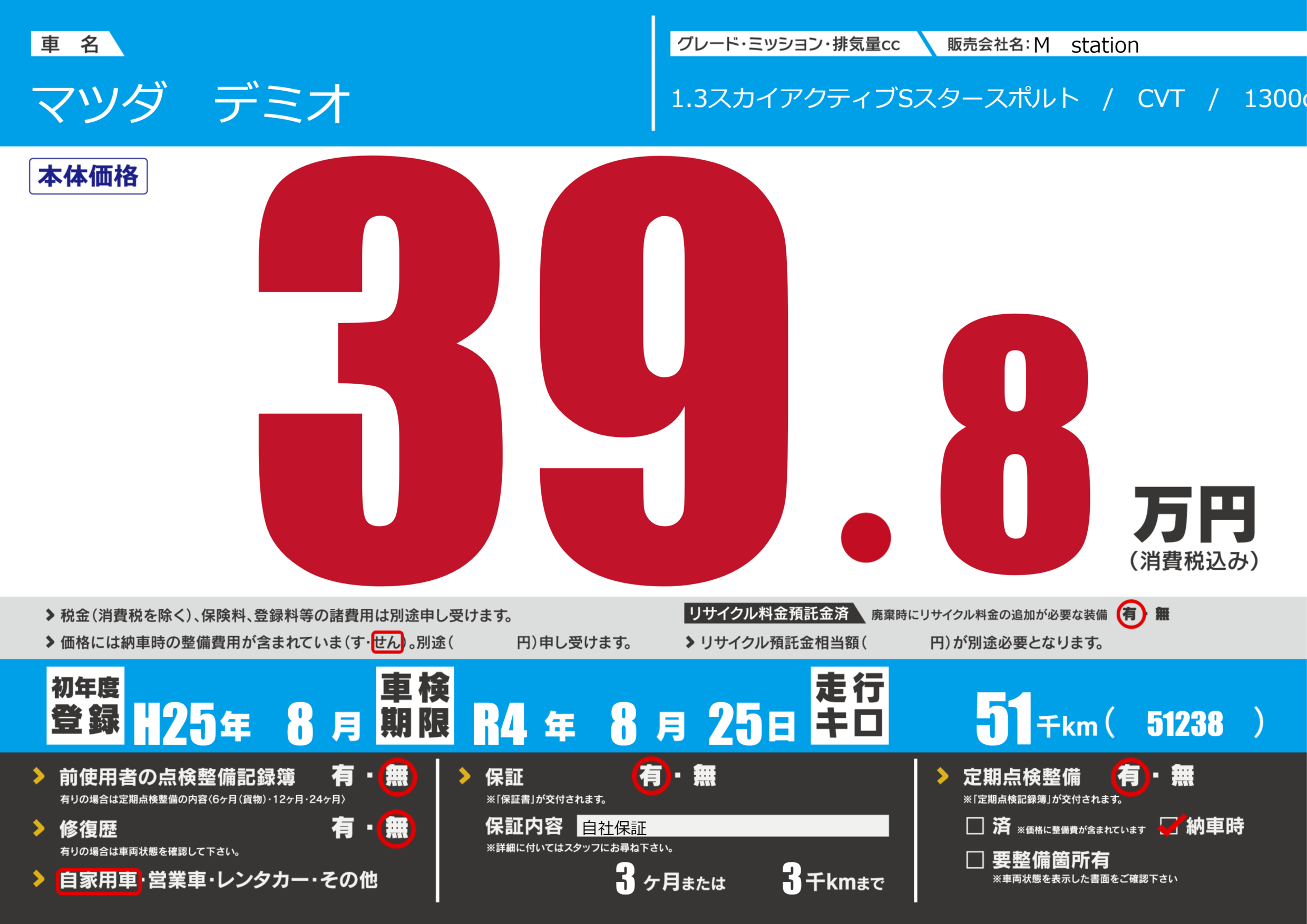 | 車名 | マツダ デミオ | グレード ミッション 排気量 |