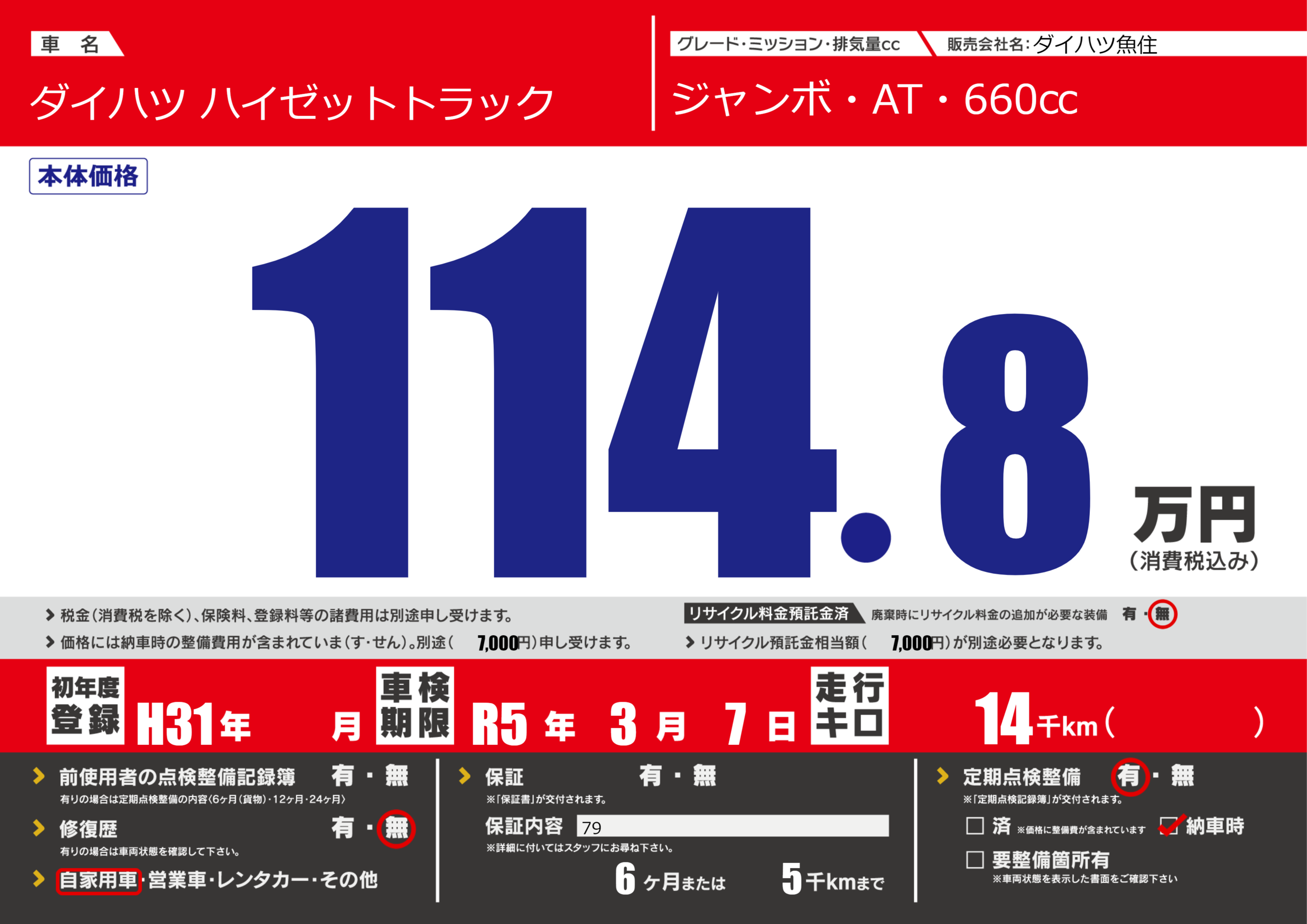 保証なし 保証内容(79) 6ヶ月または(5)千kmまで |