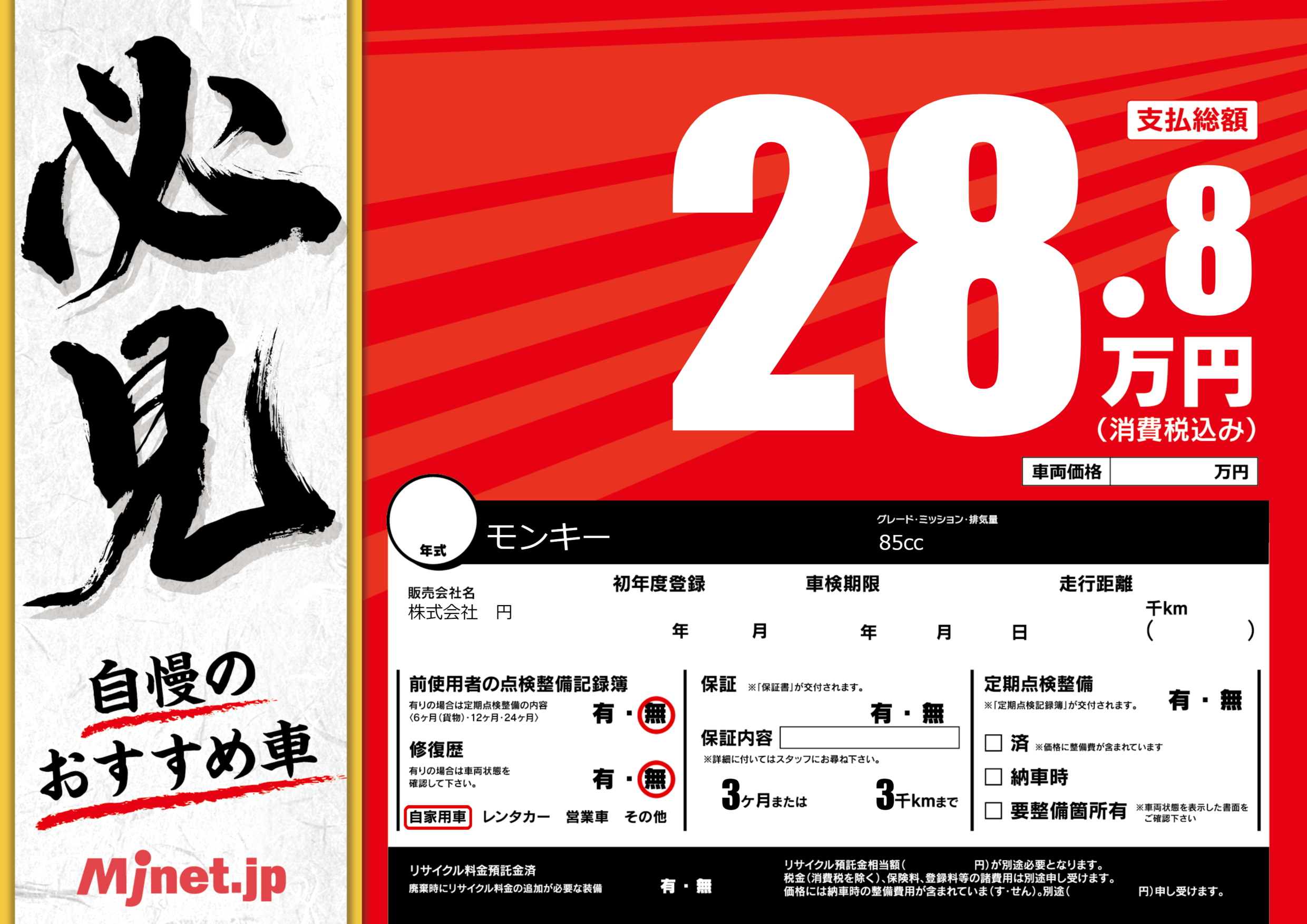保証なし 保証内容(---) 3ヶ月または(3)千kmまで |