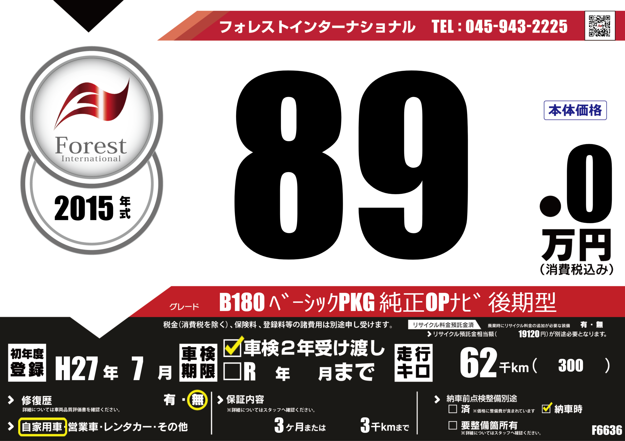 | 走行キロ | 6.2万km | 初年度登録 | H27年7月 |