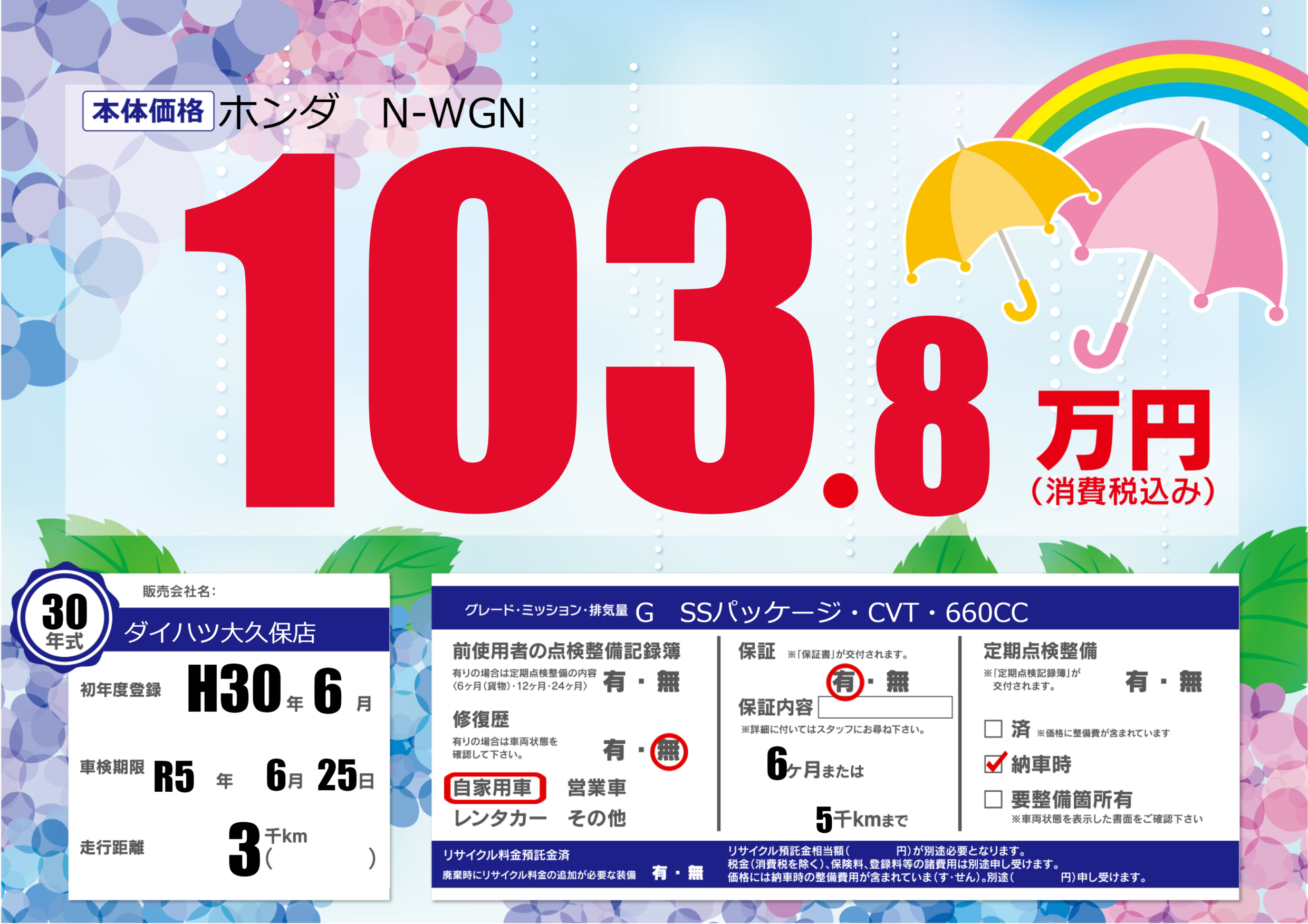 保証付き 保証内容(---) 6ヶ月または(5)千kmまで |