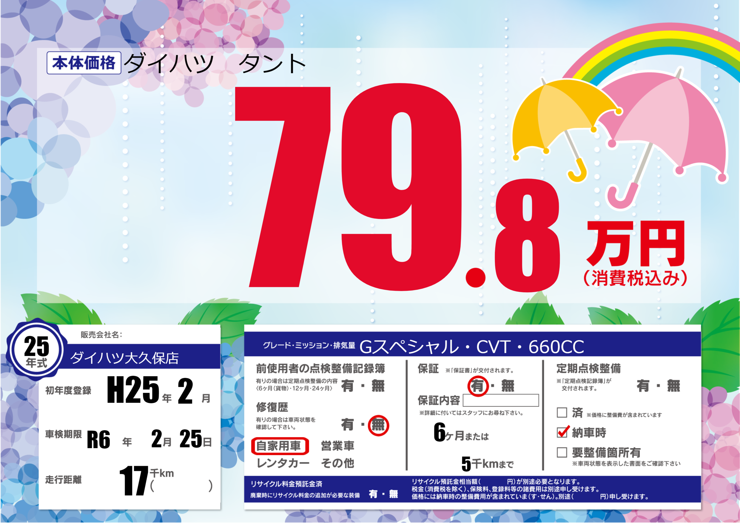 | 走行キロ | 1.7万km | 初年度登録 | H25年2月 |