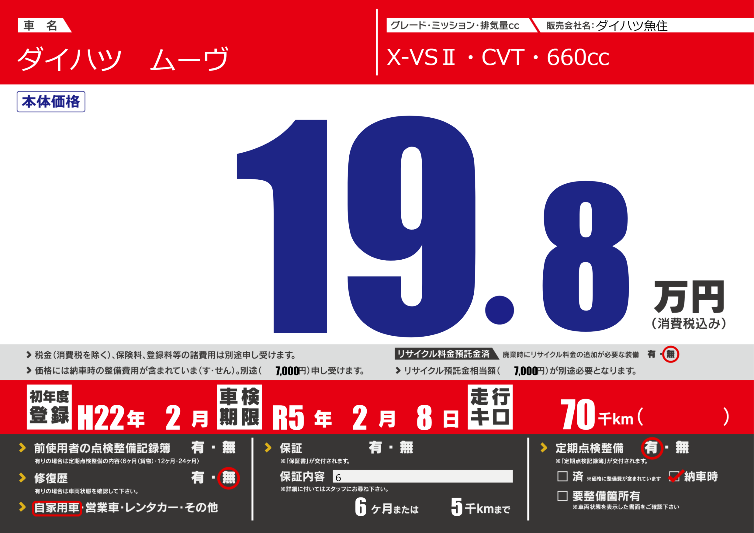 保証なし 保証内容(6) 6ヶ月または(5)千kmまで |