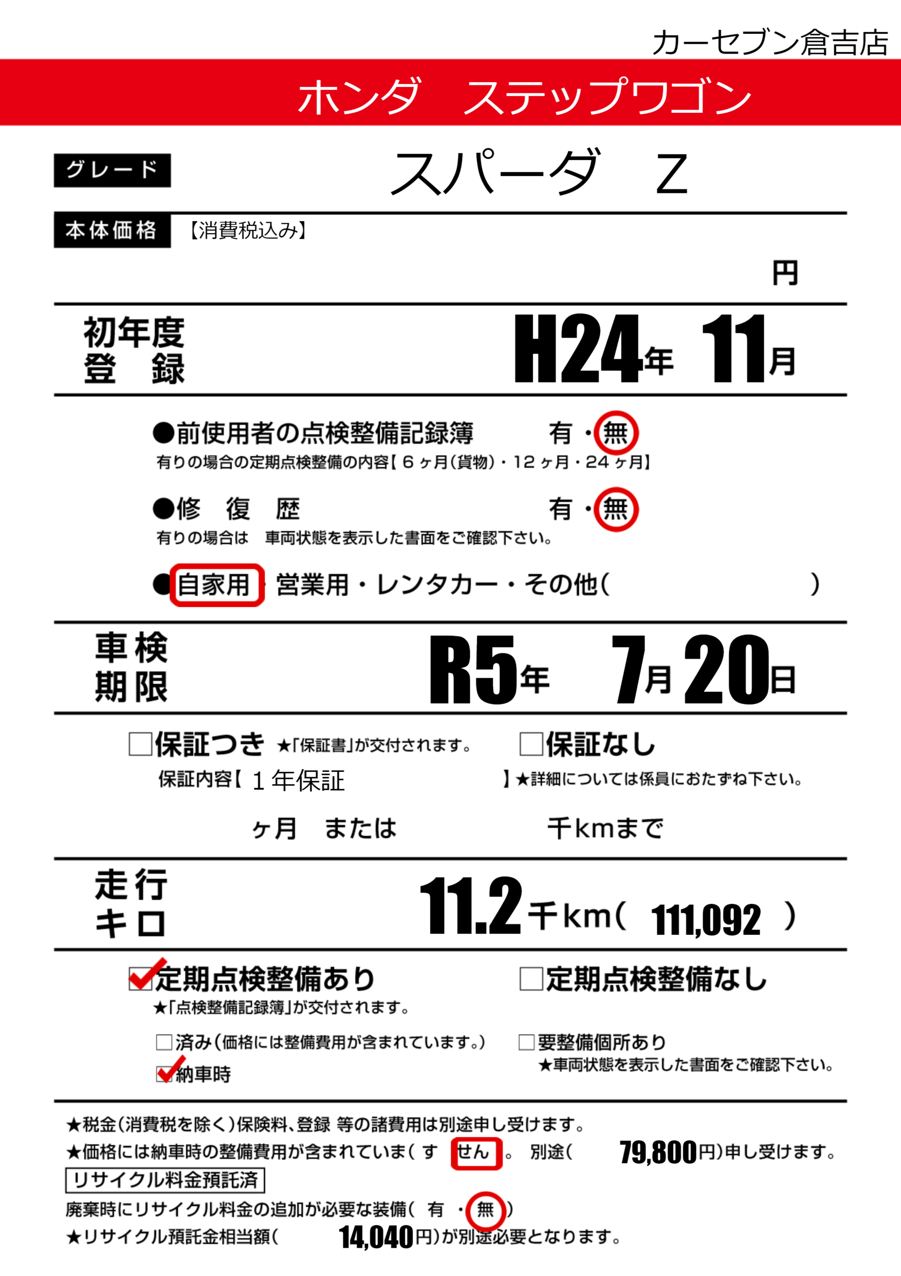 | 定期点検整備 | 定期点検整備あり 納車時あり | ||