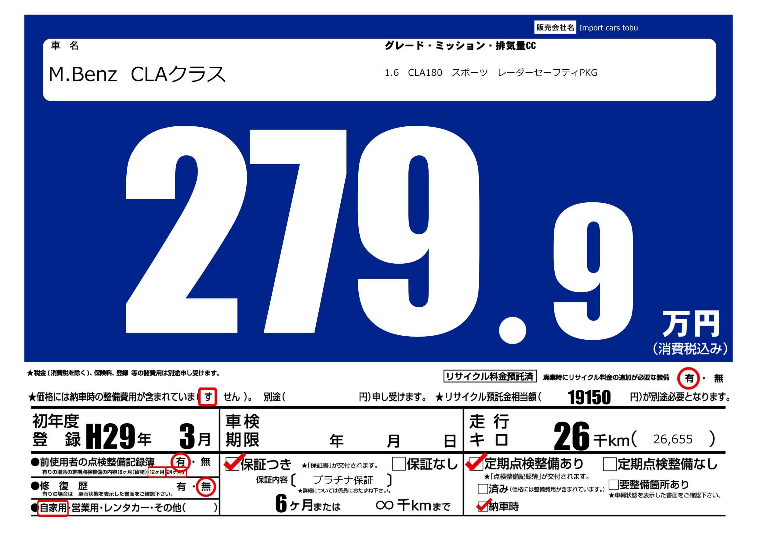 保証付き 保証内容( プラチナ保証) 6ヶ月または(∞)千kmまで |