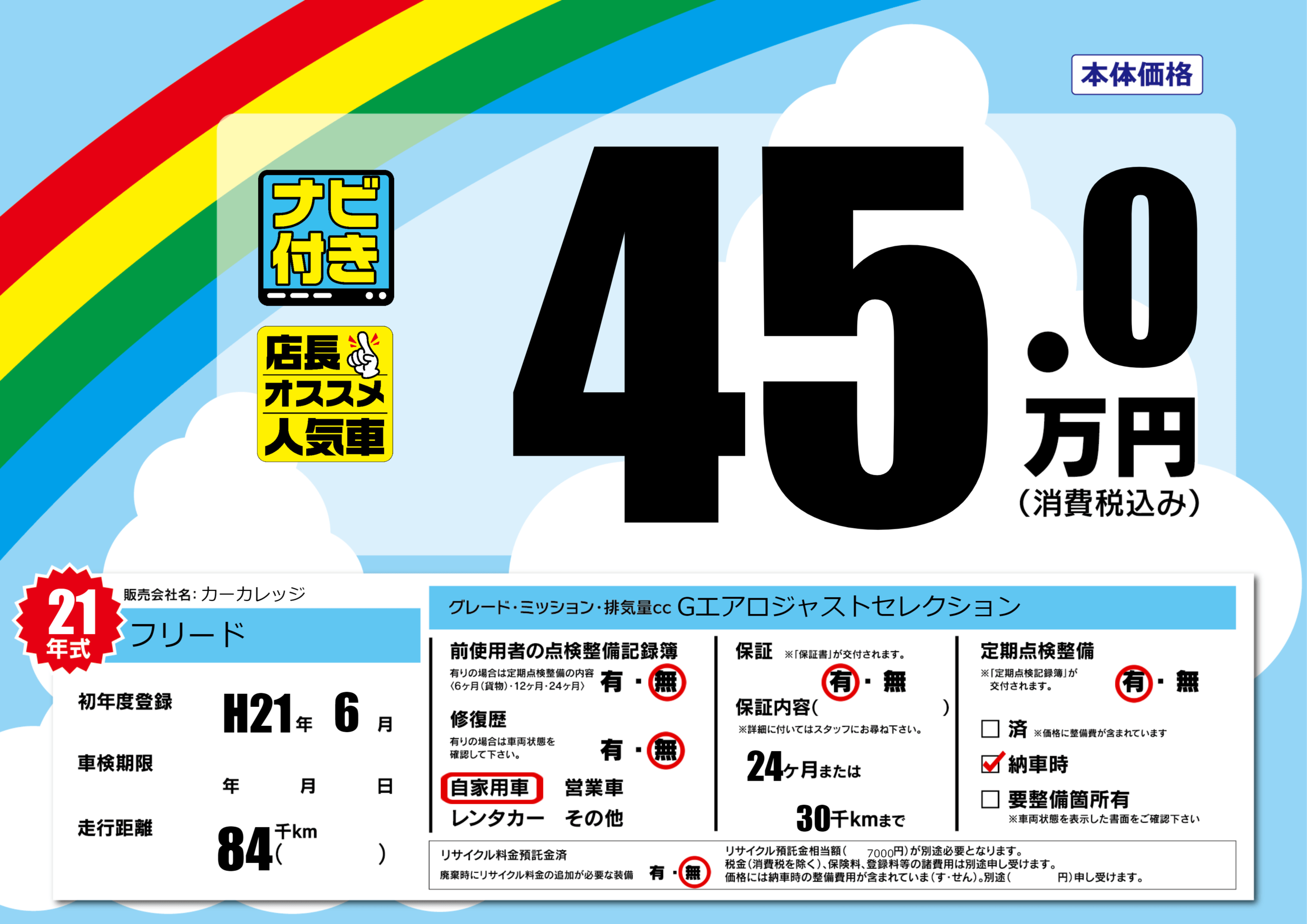 | 定期点検整備 | 定期点検整備あり 納車時あり | ||