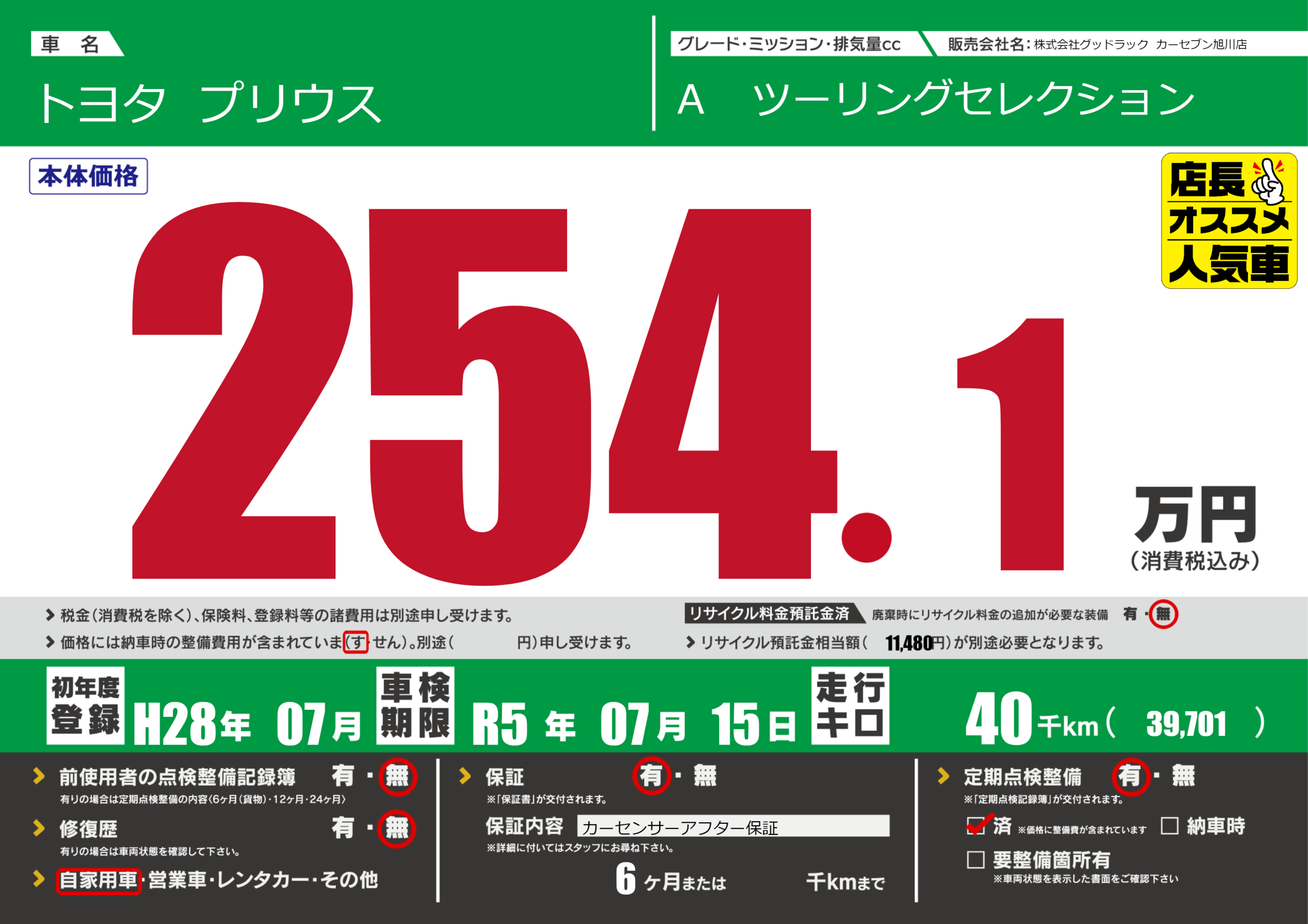 | 車名 | トヨタ プリウス | グレード ミッション 排気量 |