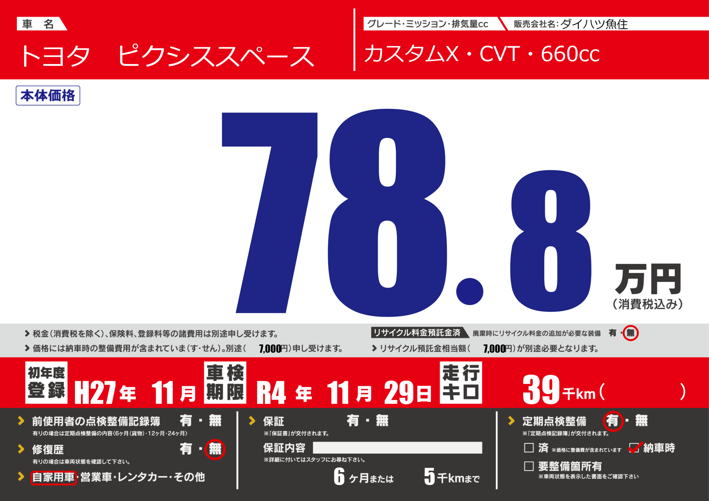| 定期点検整備 | 定期点検整備あり 納車時あり | ||