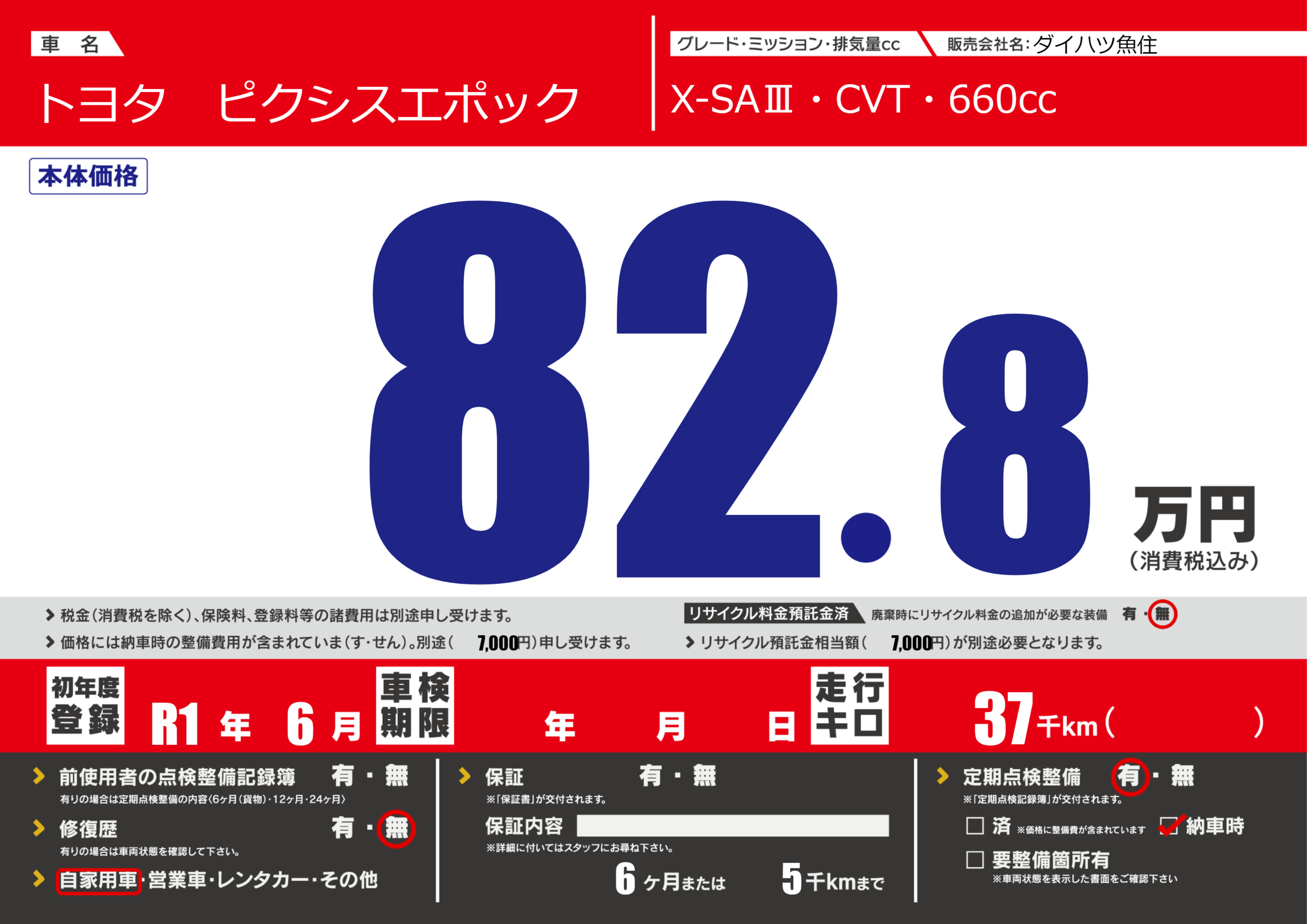 | 車名 | トヨタ ピクシスエポック | グレード ミッション 排気量 |