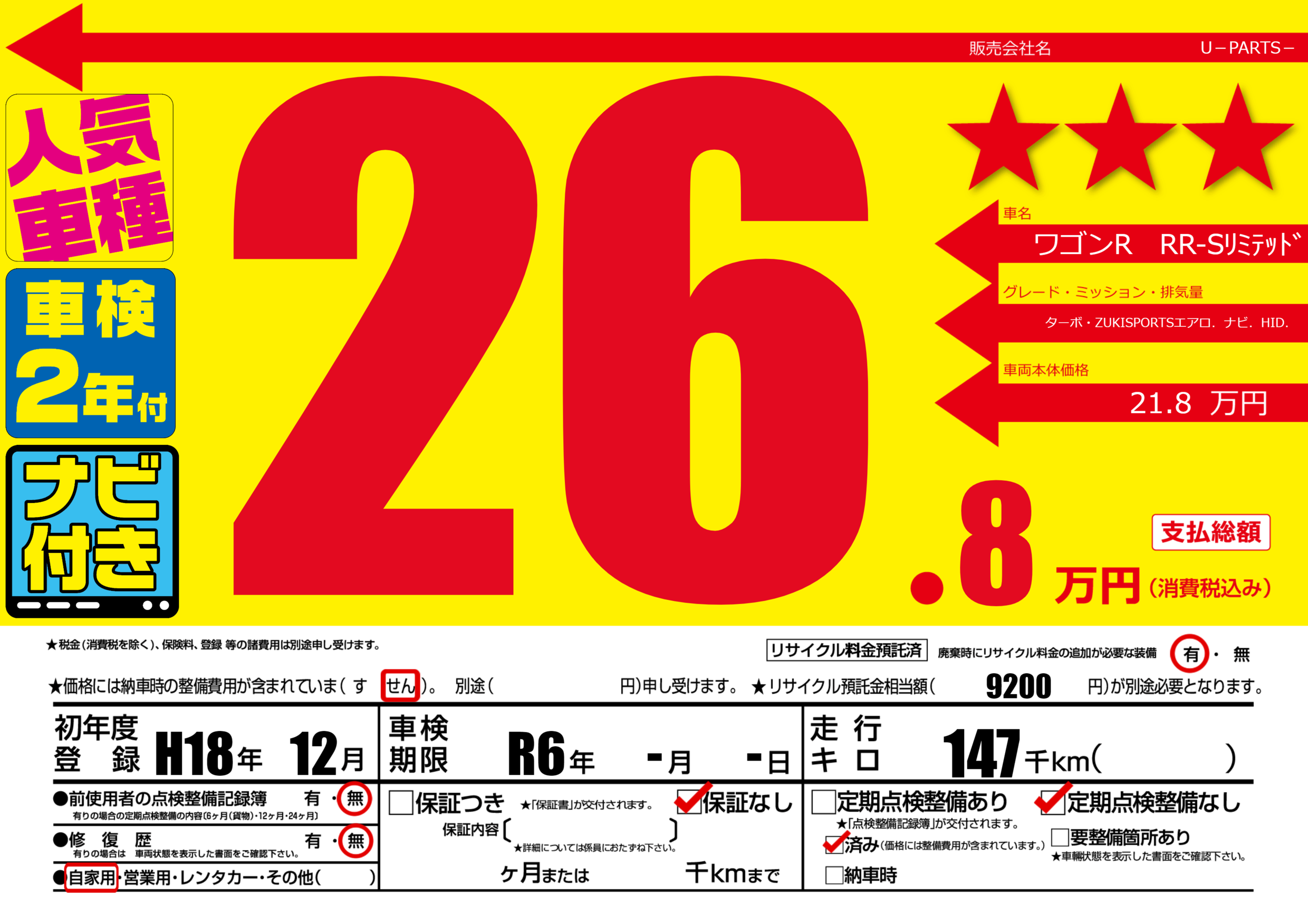 | 走行キロ | 14.7万km | 初年度登録 | H18年12月 |