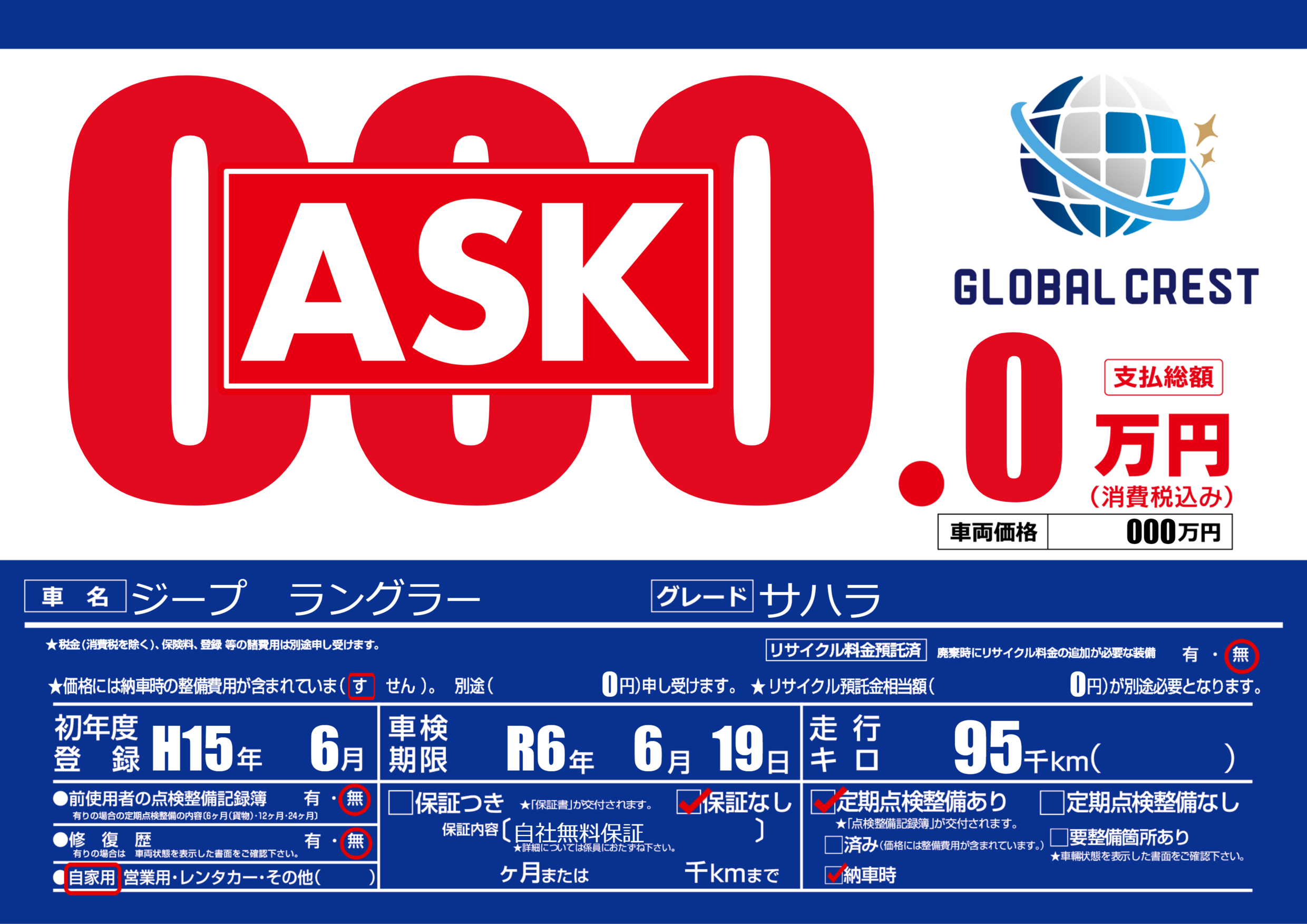 保証なし 保証内容(自社無料保証) ---ヶ月または()千kmまで |
