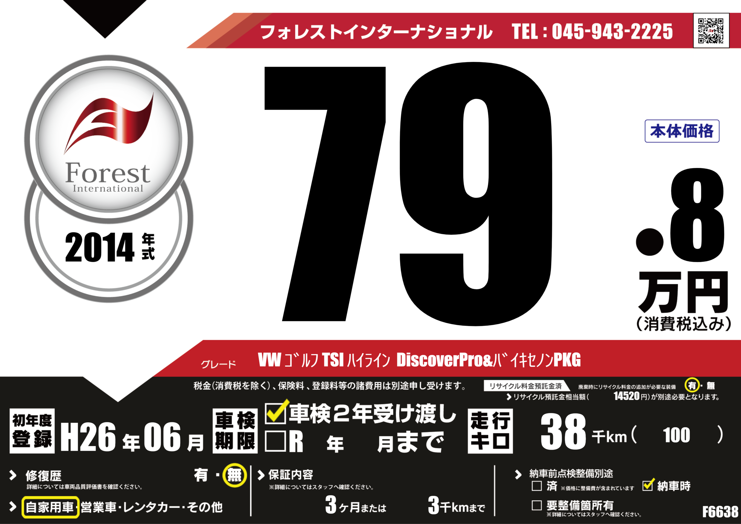 | 走行キロ | 3.8万km | 初年度登録 | H26年06月 |
