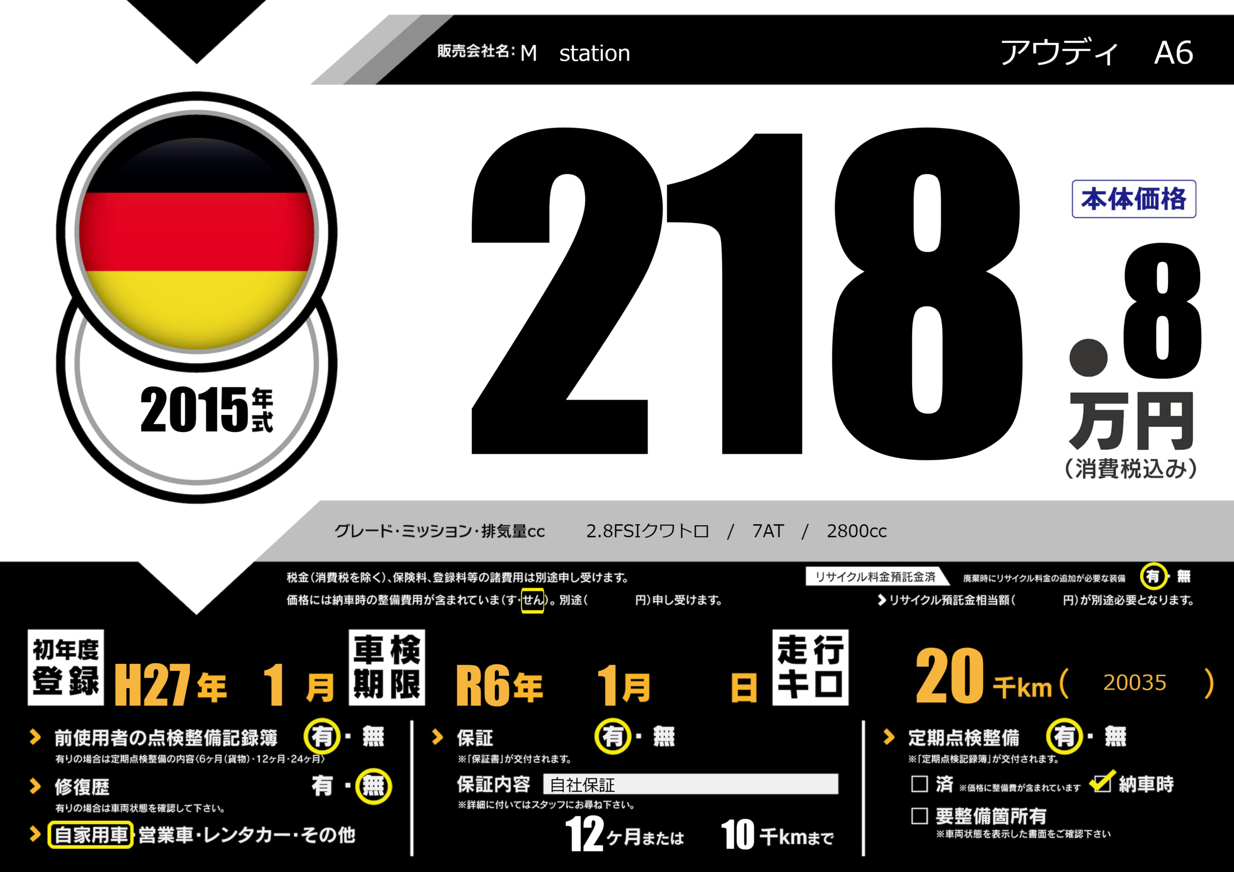 | 車名 | アウディ A6 | グレード ミッション 排気量 |