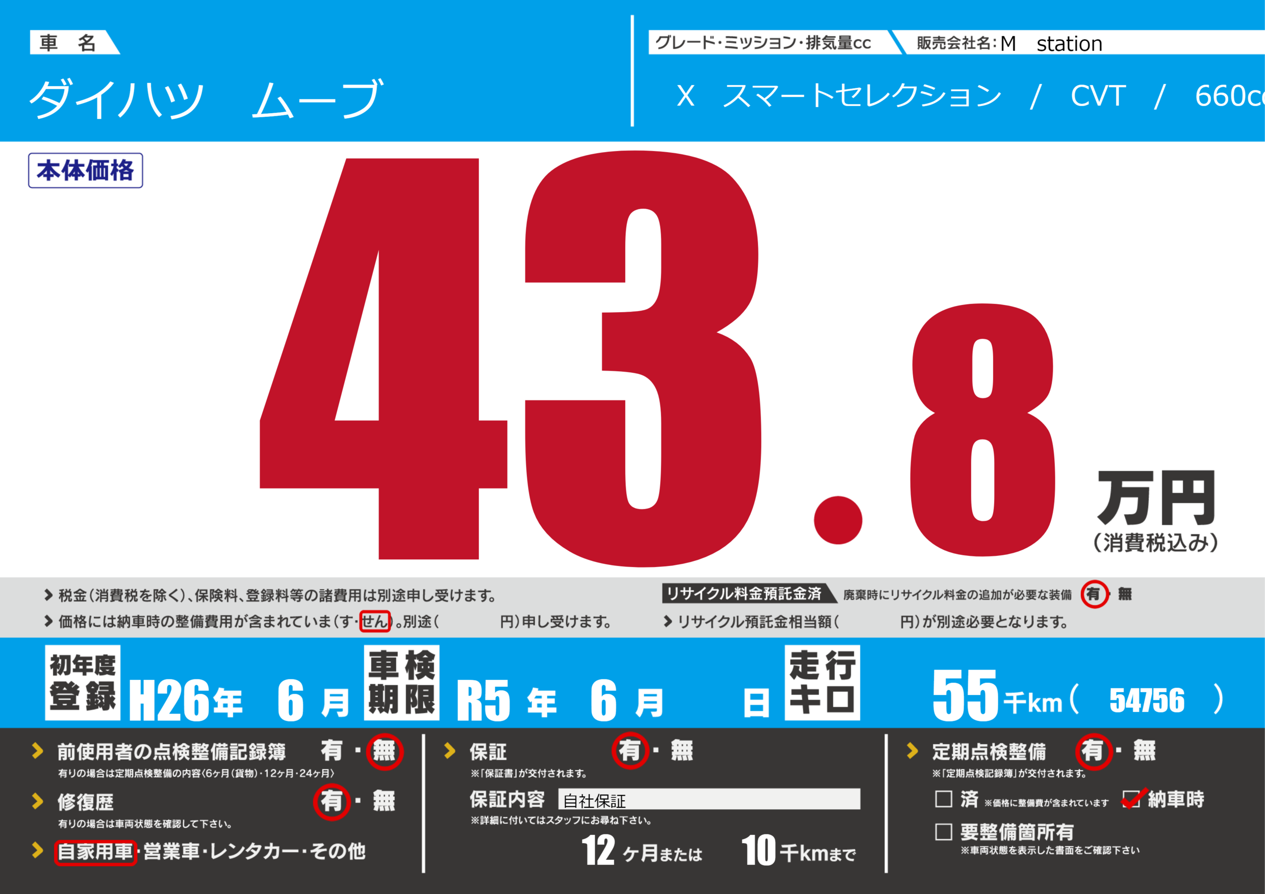 | 車名 | ダイハツ ムーブ | グレード ミッション 排気量 |