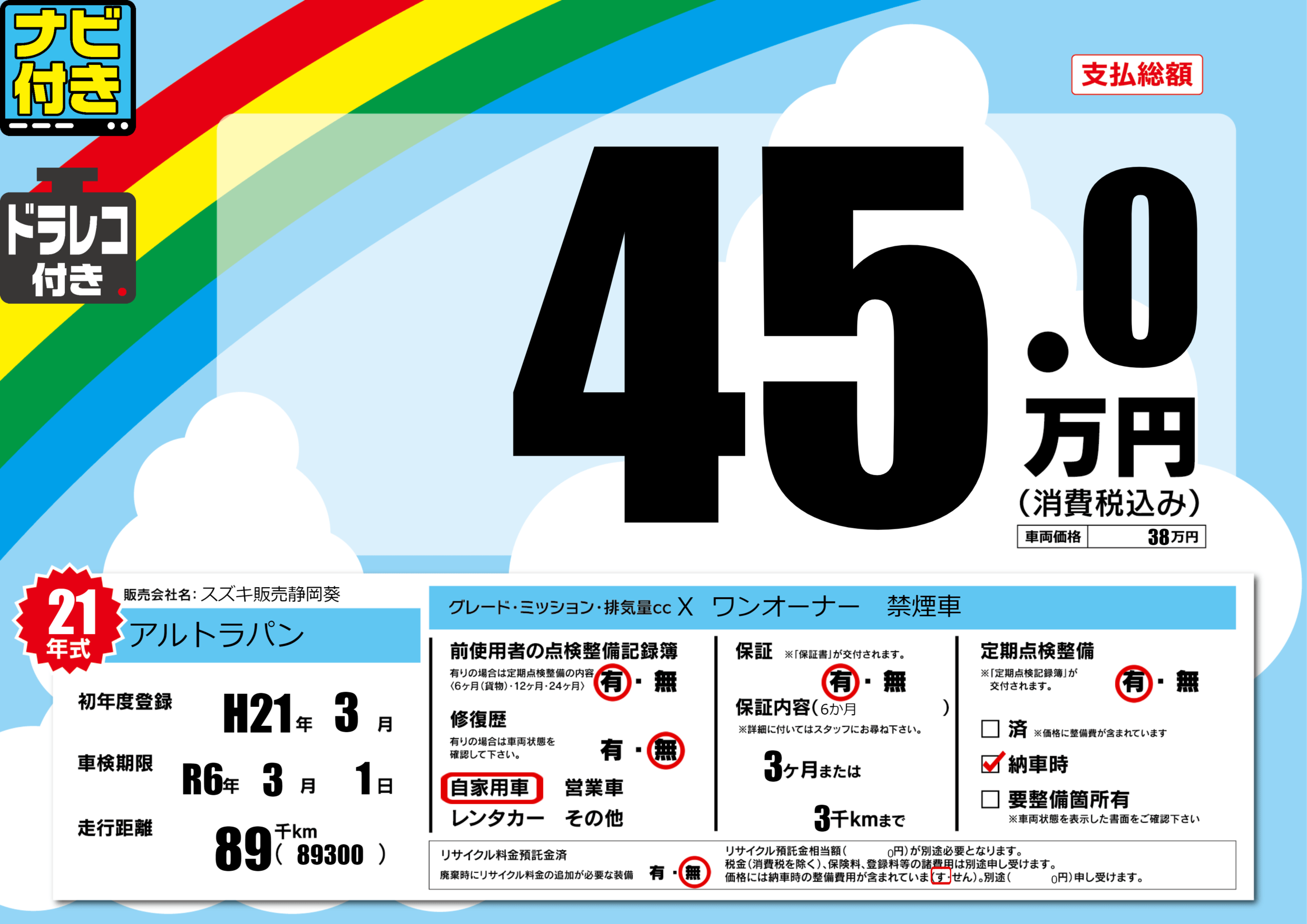 | 走行キロ | 8.9万km | 初年度登録 | H21年3月 |